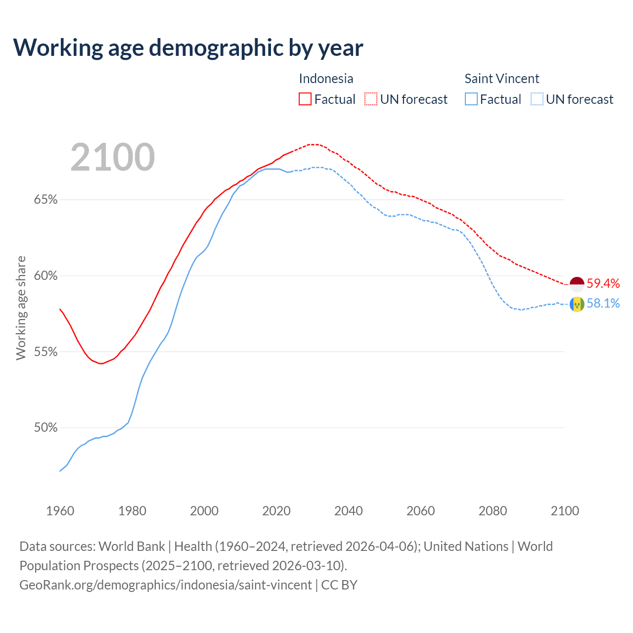 - Indonesia has 197M working age adults (aged 15-64) vs 66.3K in Saint Vincent.