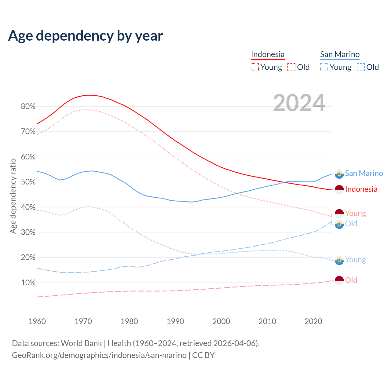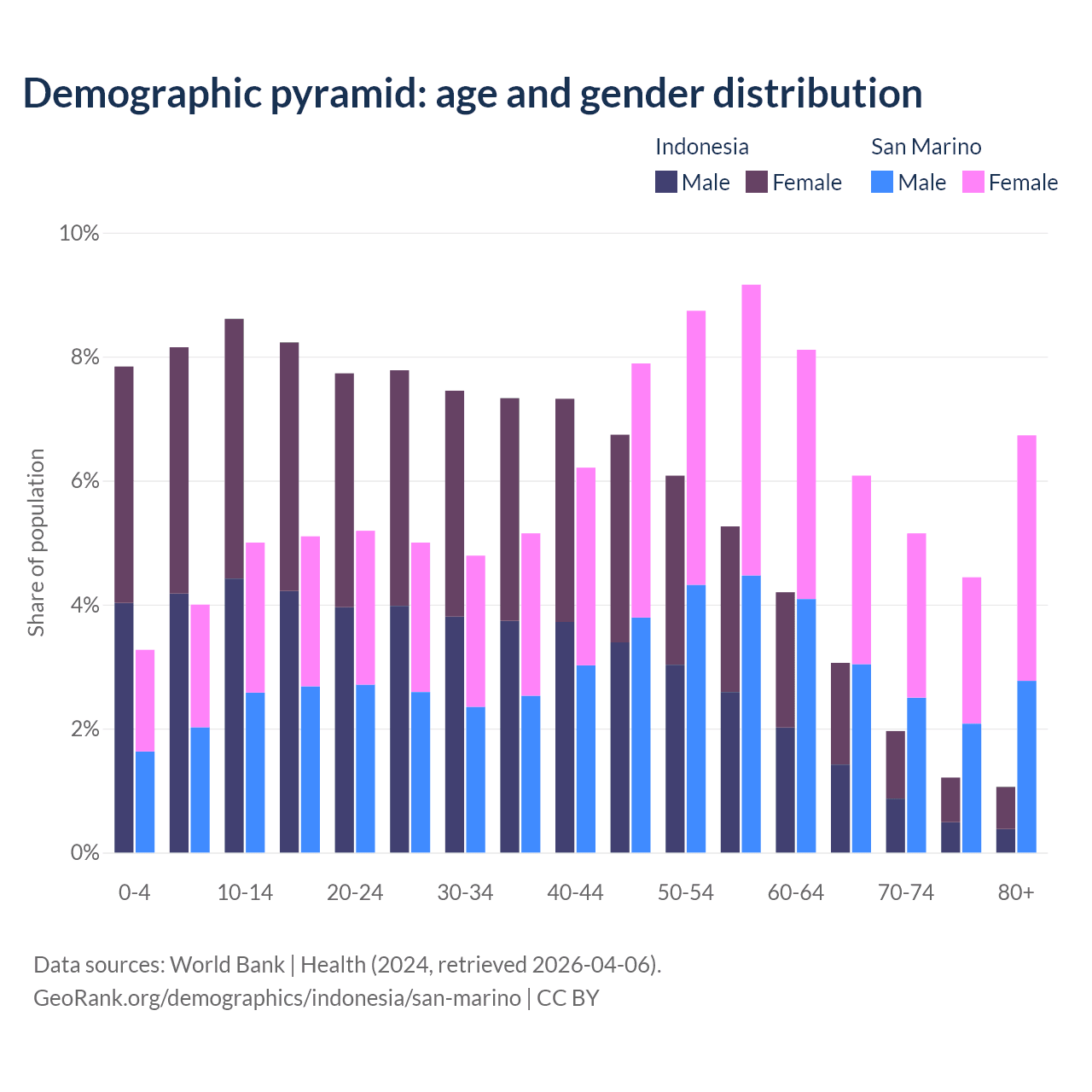 - Indonesia is ranked 93/196 by median age (oldest to youngest) vs 3/196 for San Marino.