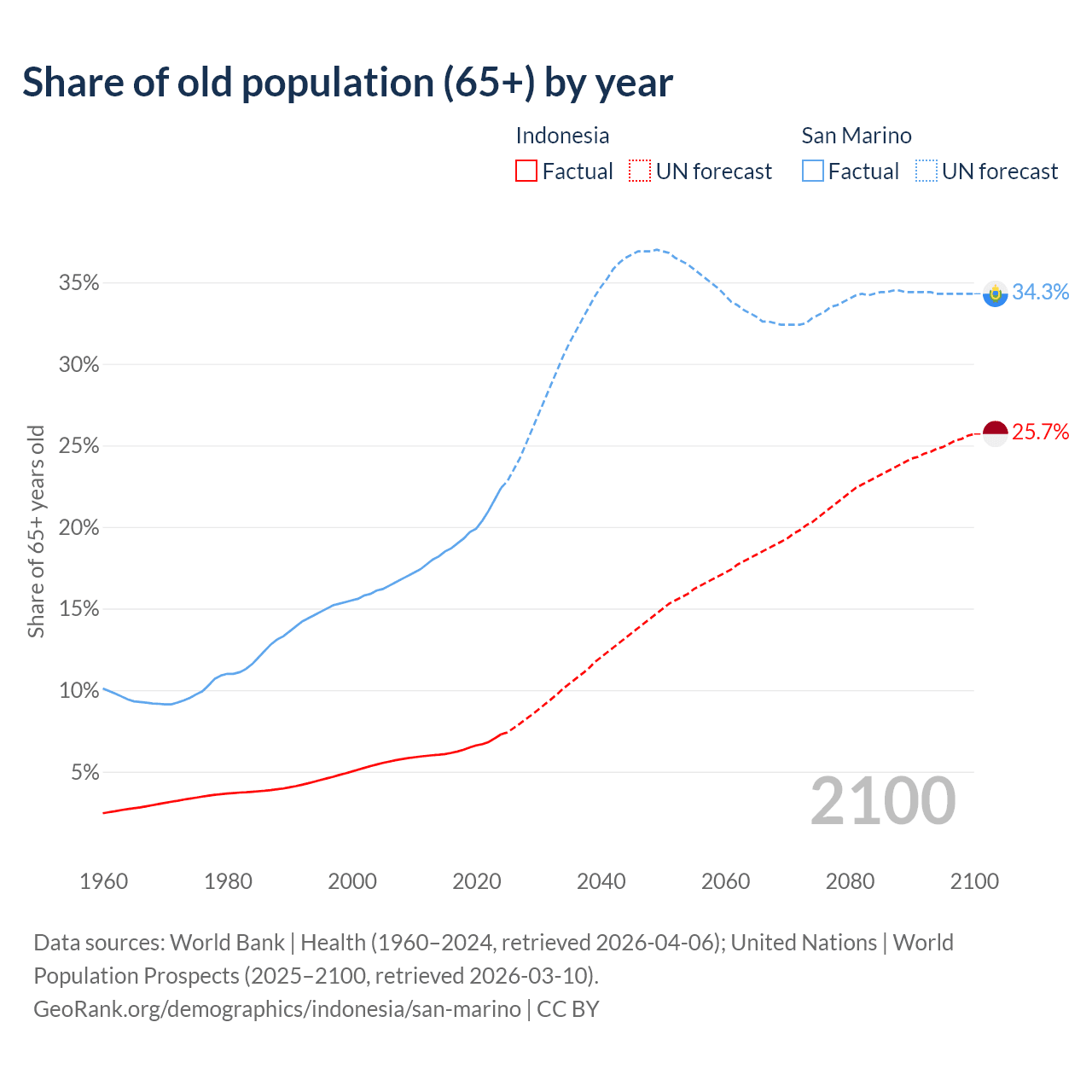 The share of older people aged 65 and over is 7.29% in Indonesia and 22.4% in San Marino. Life expectancy in Indonesia compared to San Marino .