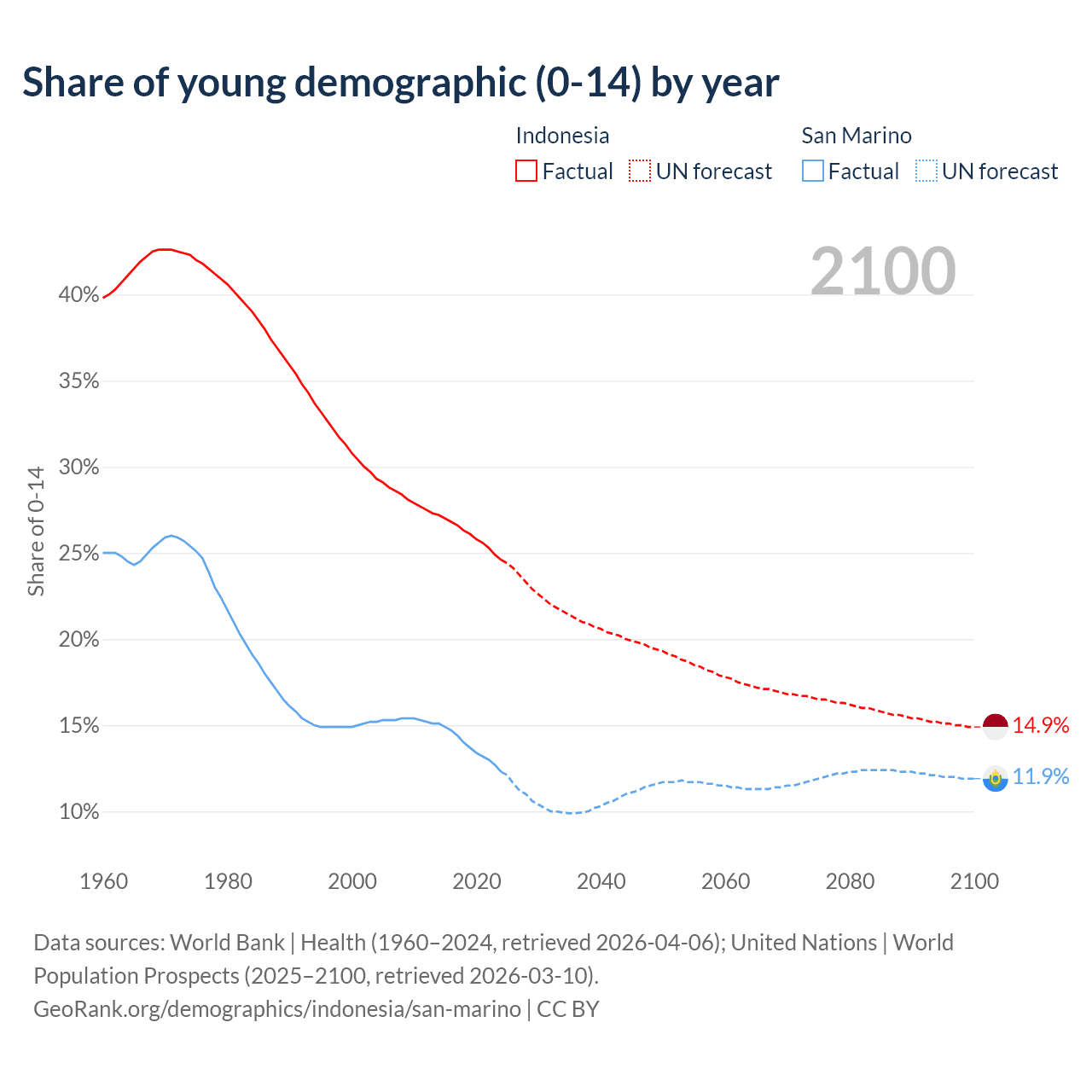 - The share of young demographic (0-15 years old) in Indonesia is 24.6% vs 12.3% in San Marino.