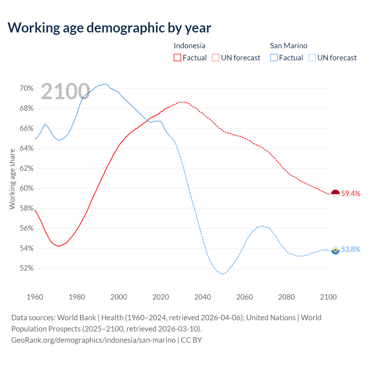 - Indonesia has 197M working age adults (aged 15-64) vs 22.2K in San Marino.