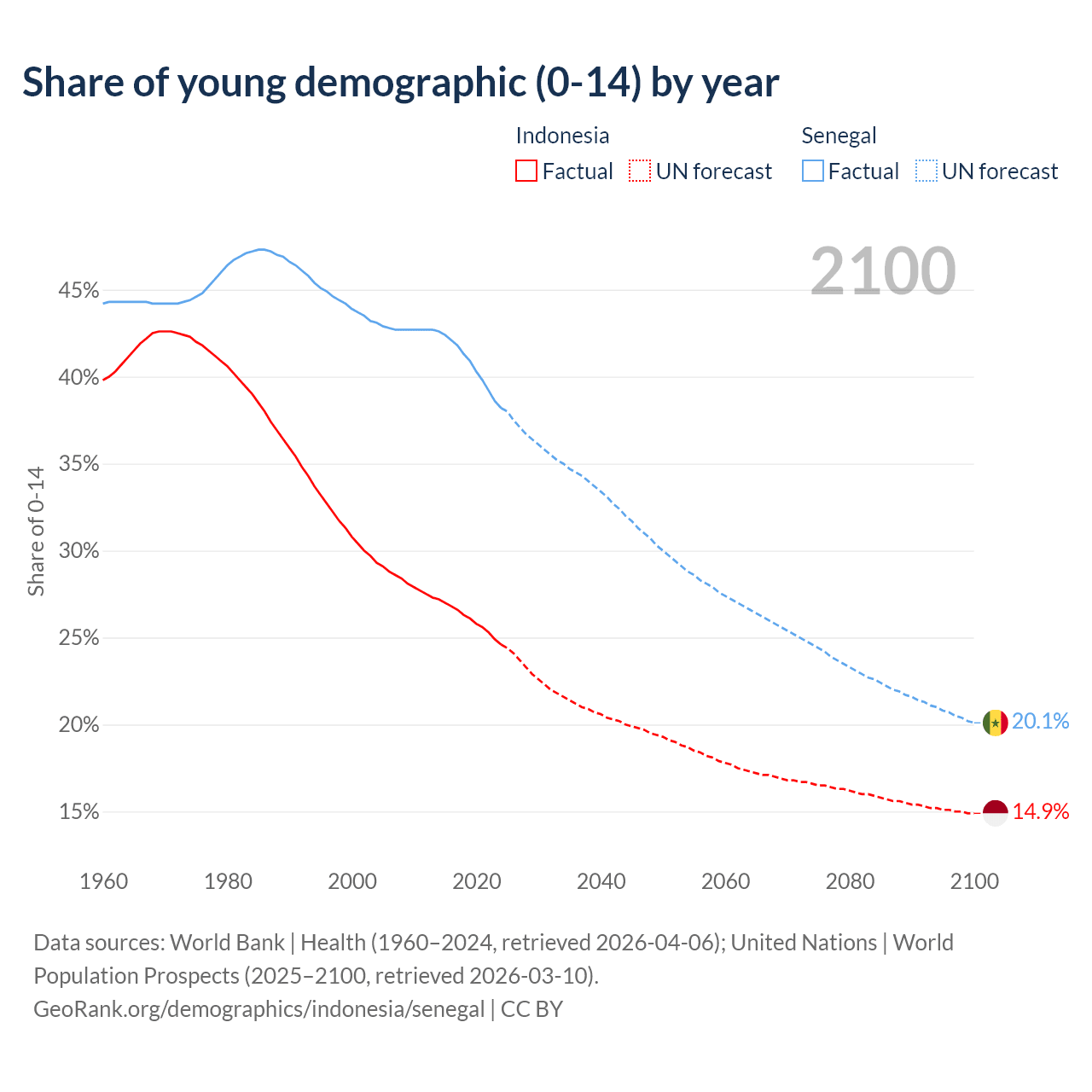 - As of 2026, the population of Indonesia is 289M vs 19.5M in Senegal - 14.8 times difference.