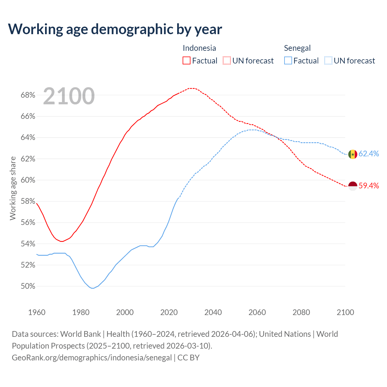 - Indonesia is ranked 93/196 by median age (oldest to youngest) vs 162/196 for Senegal.