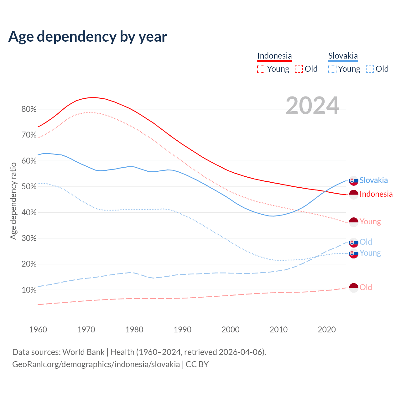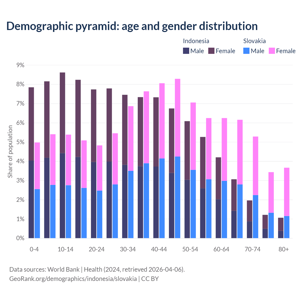 - Indonesia is ranked 93/196 by median age (oldest to youngest) vs 31/196 for Slovakia.