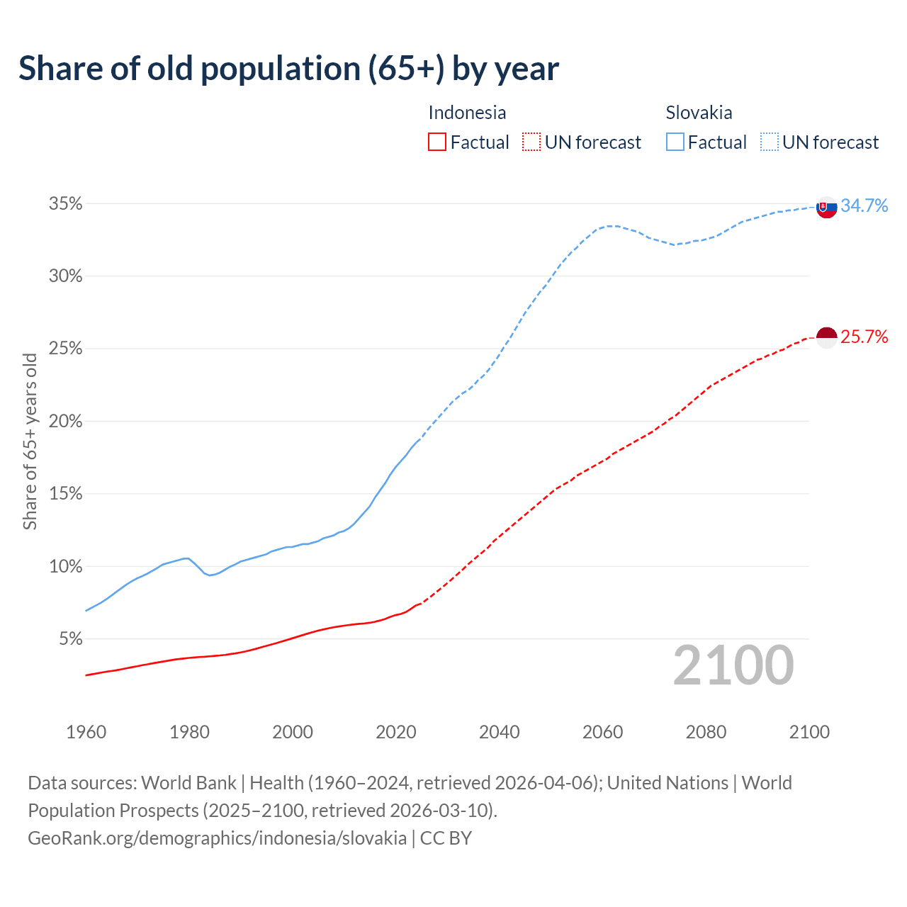 The share of older people aged 65 and over is 7.29% in Indonesia and 18.5% in Slovakia. Life expectancy in Indonesia compared to Slovakia .