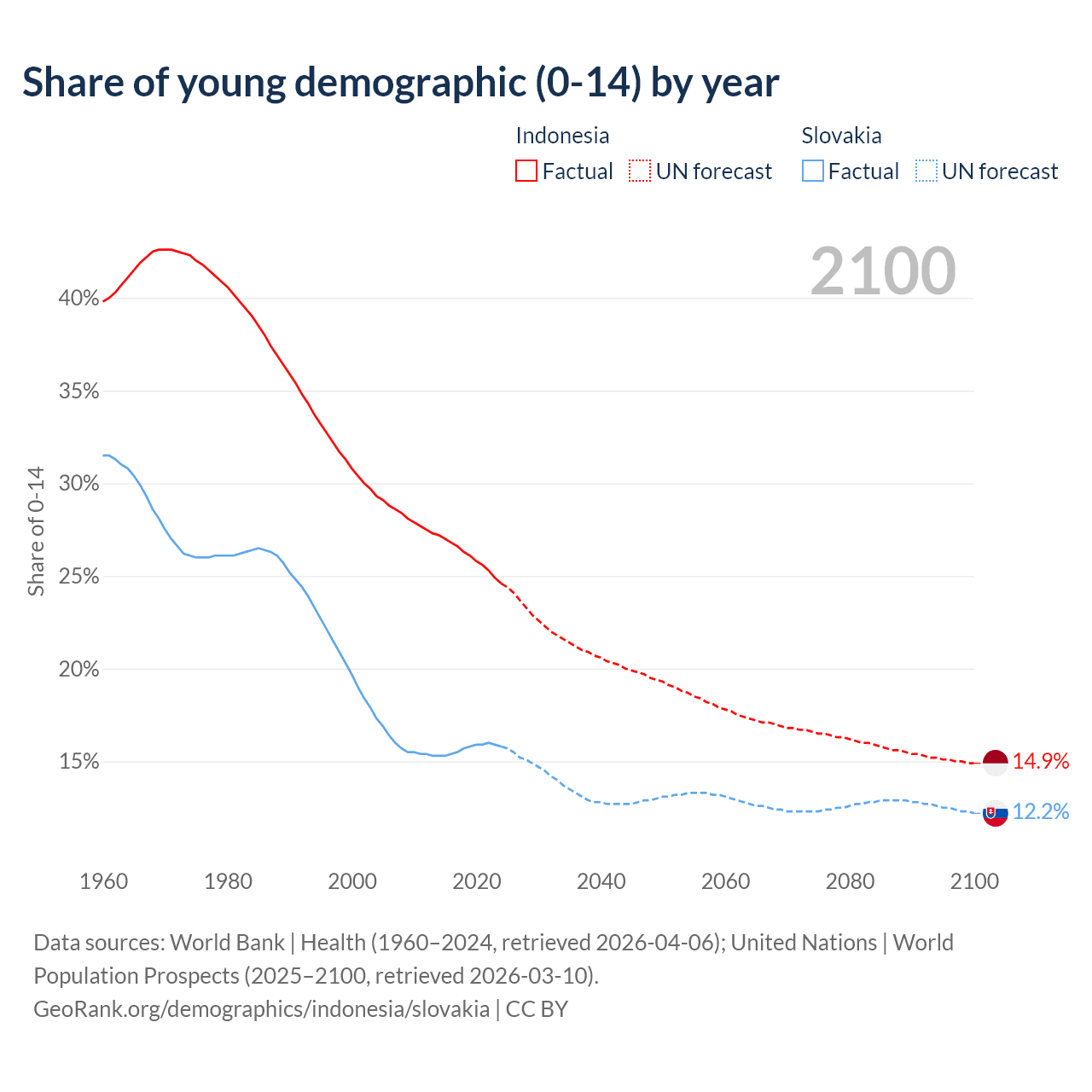 - The share of young demographic (0-15 years old) in Indonesia is 24.6% vs 15.8% in Slovakia.