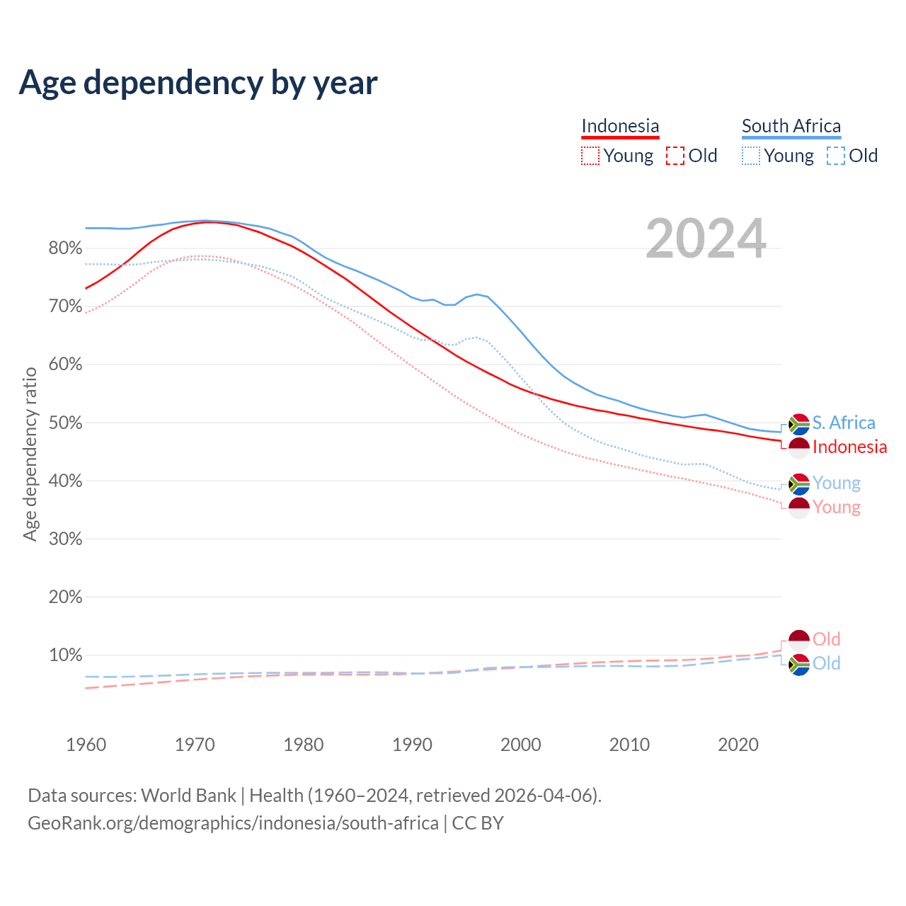 - Indonesia is ranked 93/196 by median age (oldest to youngest) vs 107/196 for South Africa.