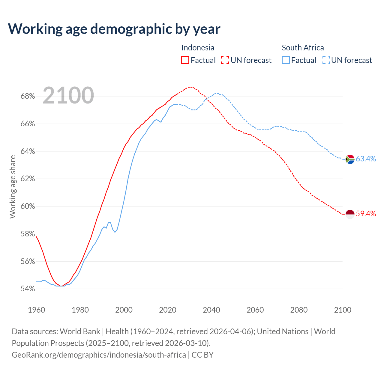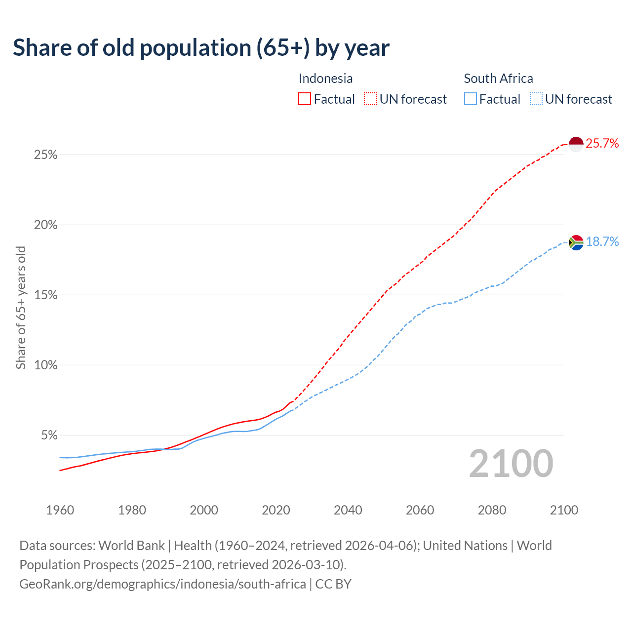 Median age Indonesia vs South Africa, 1960-2100