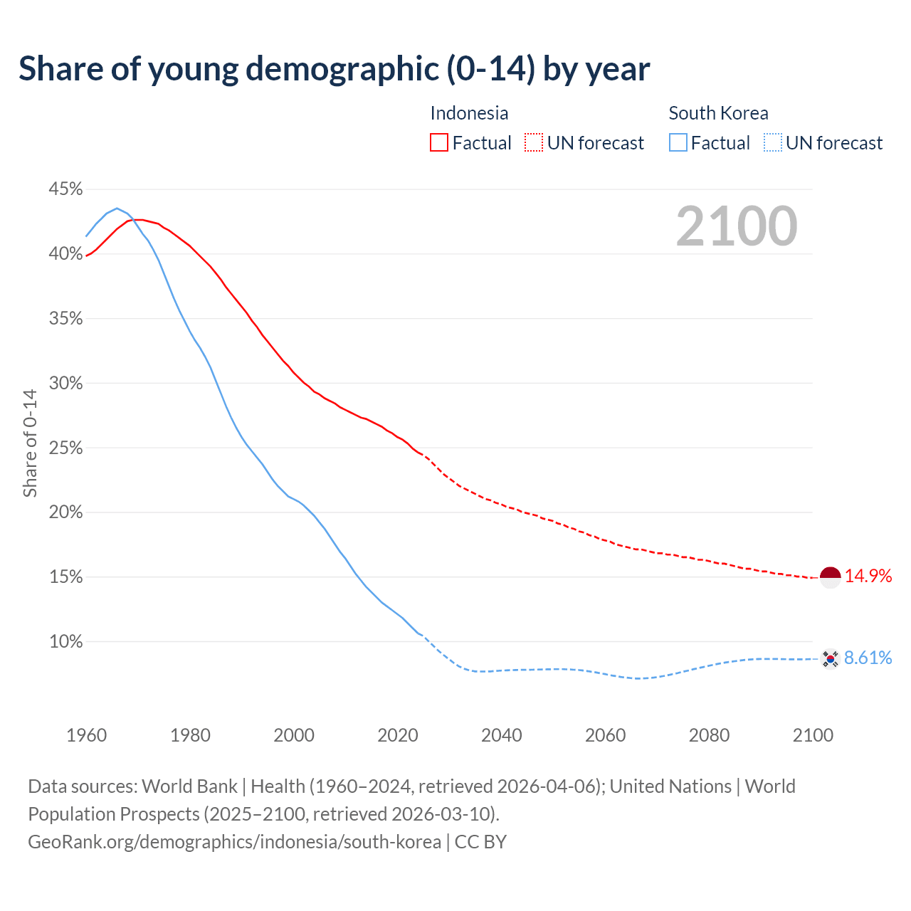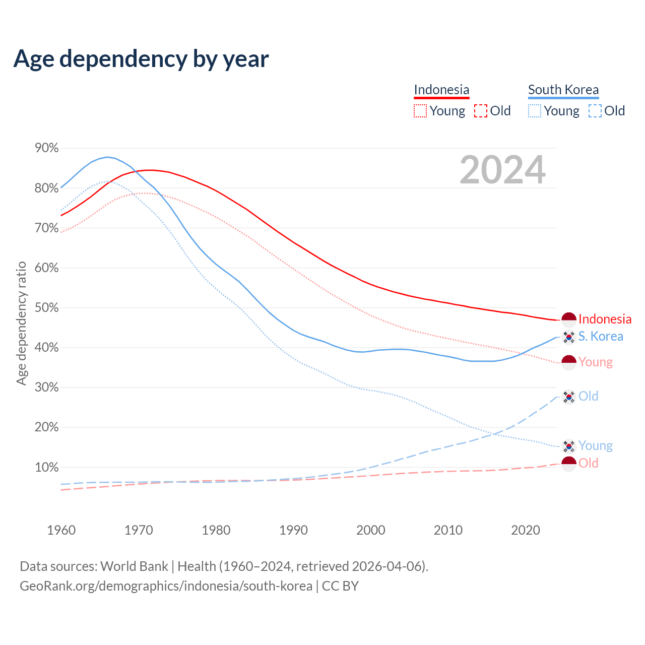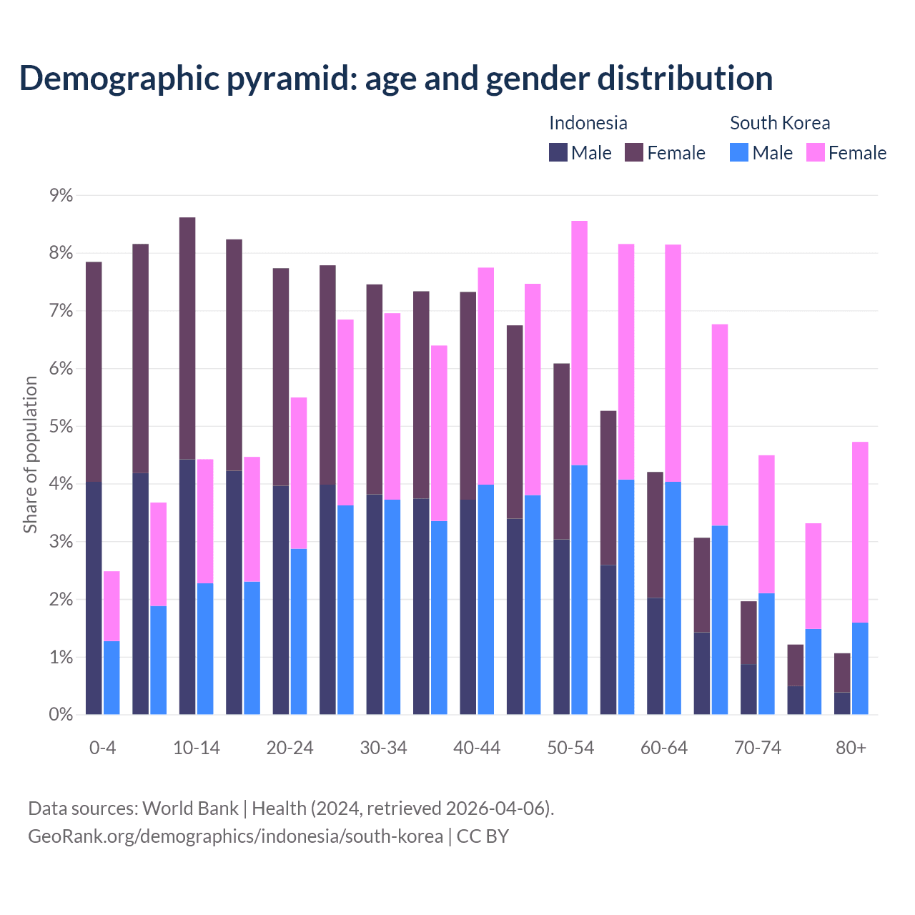 - Indonesia is ranked 93/196 by median age (oldest to youngest) vs 10/196 for South Korea.