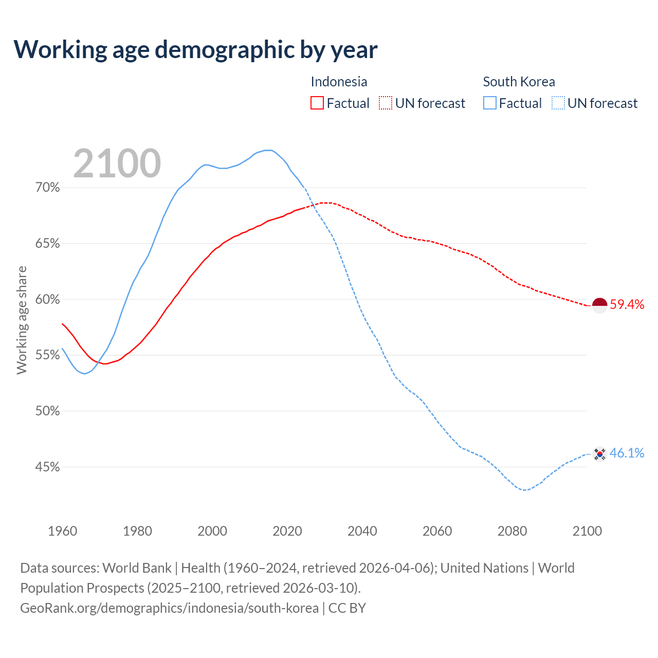- Indonesia has 197M working age adults (aged 15-64) vs 36.2M in South Korea.