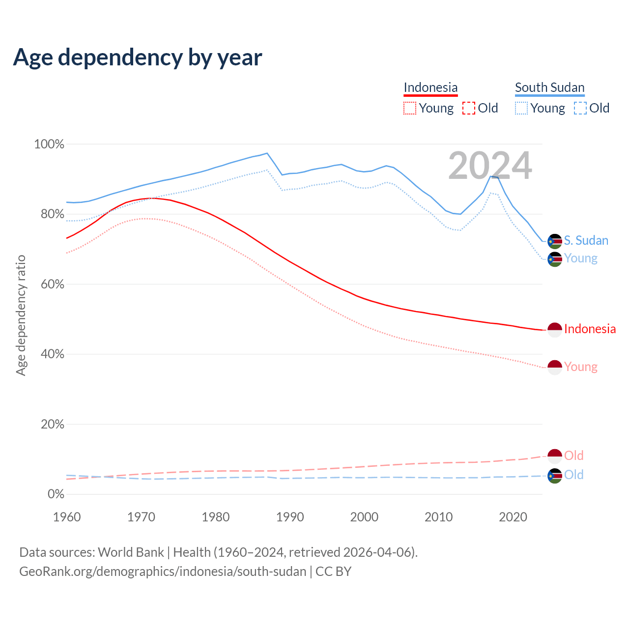 Data sources: World Bank | Health (1960–2024, retrieved 2026-04-06); U.S. Census Bureau (1960–2024, retrieved 2026-02-08).