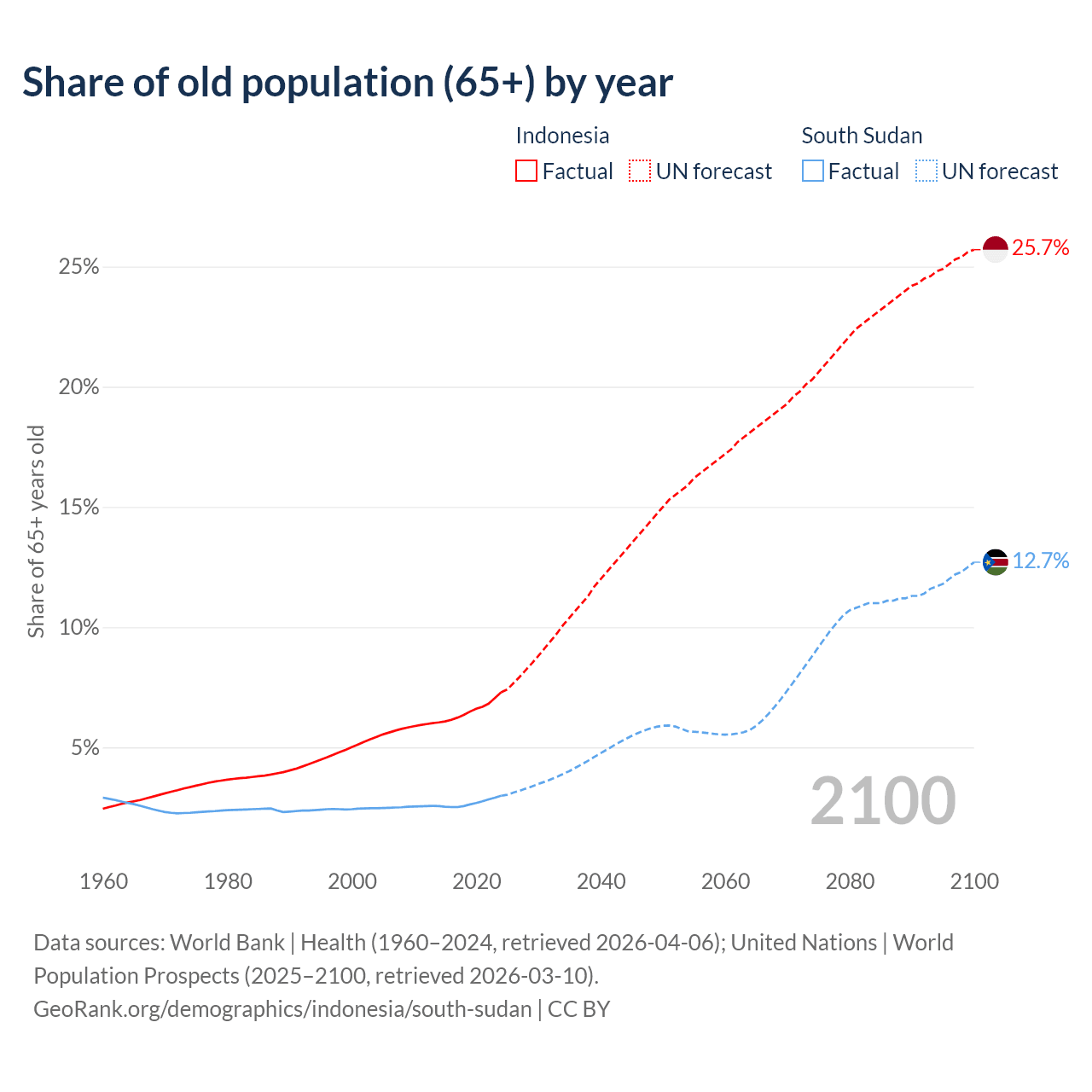 The share of older people aged 65 and over is 7.29% in Indonesia and 2.99% in South Sudan. Life expectancy in Indonesia compared to South Sudan .