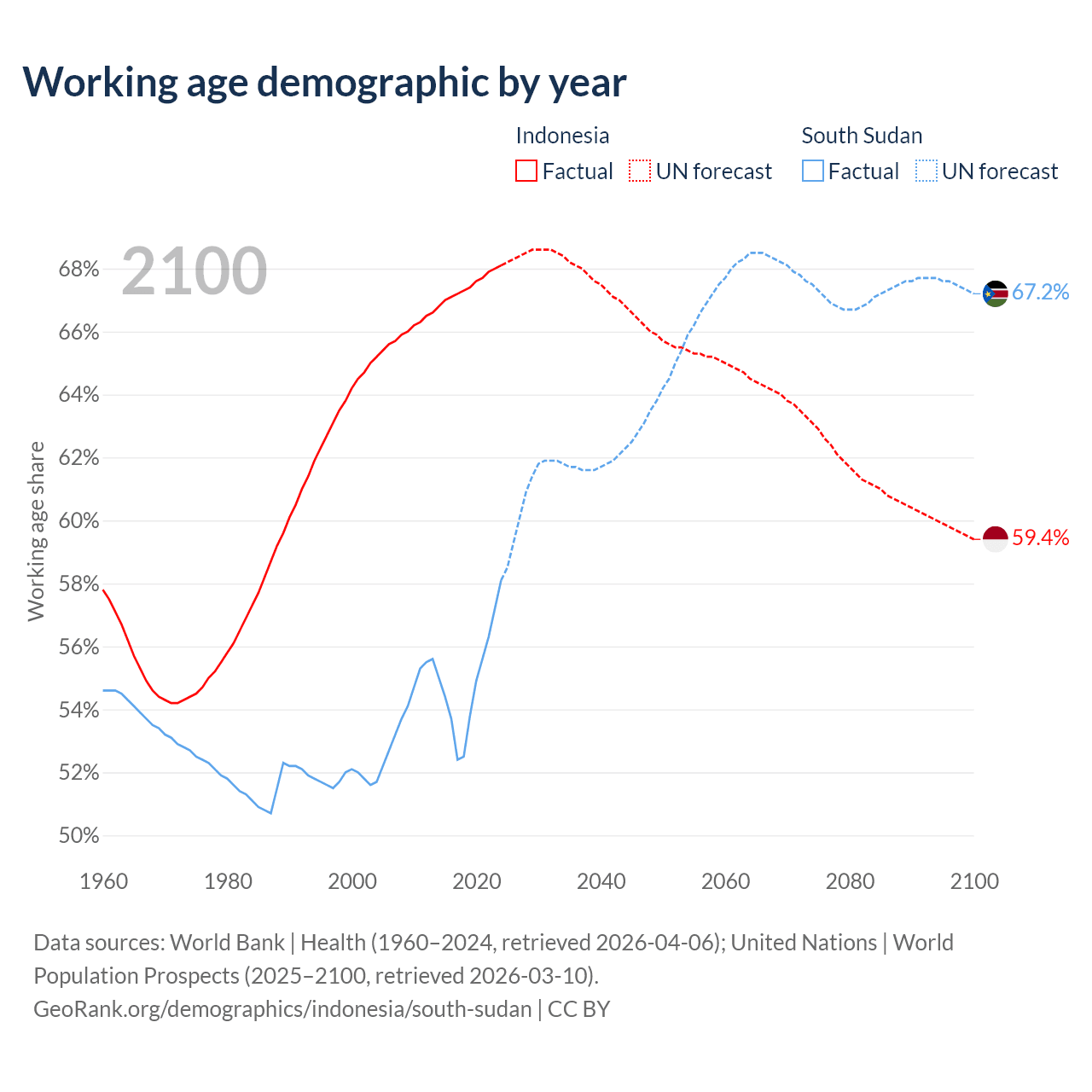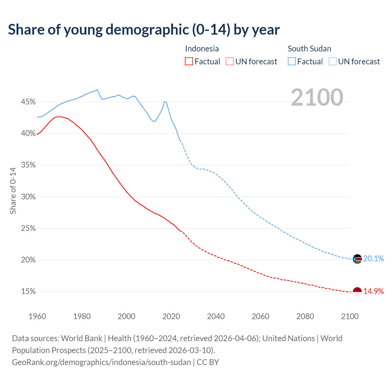 Median age Indonesia vs South Sudan, 1960-2100