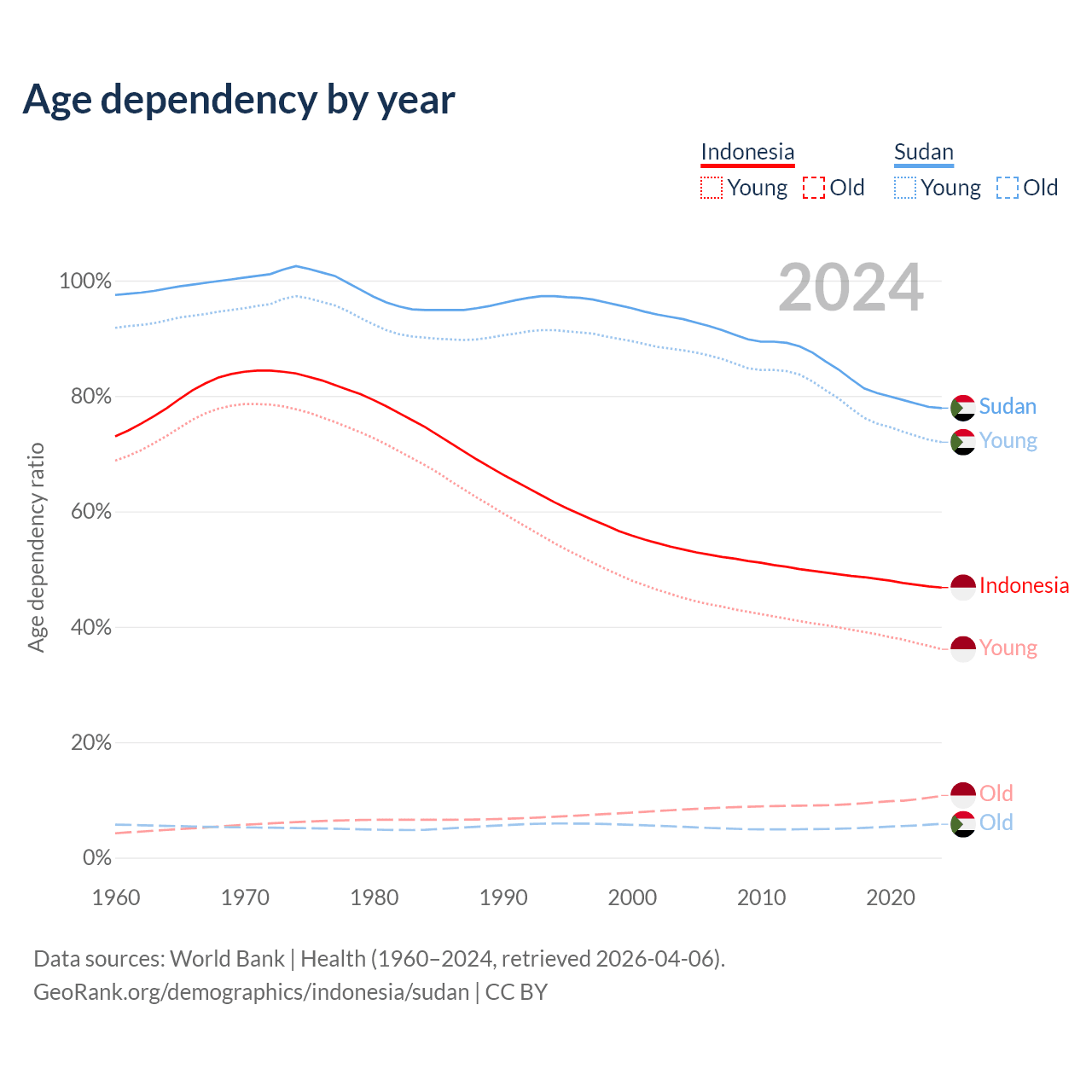 Data sources: World Bank | Health (1960–2024, retrieved 2026-04-06); U.S. Census Bureau (1960–2024, retrieved 2026-02-08).