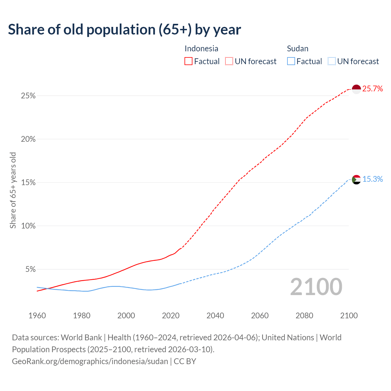 The share of older people aged 65 and over is 7.29% in Indonesia and 3.3% in Sudan. Life expectancy in Indonesia compared to Sudan .