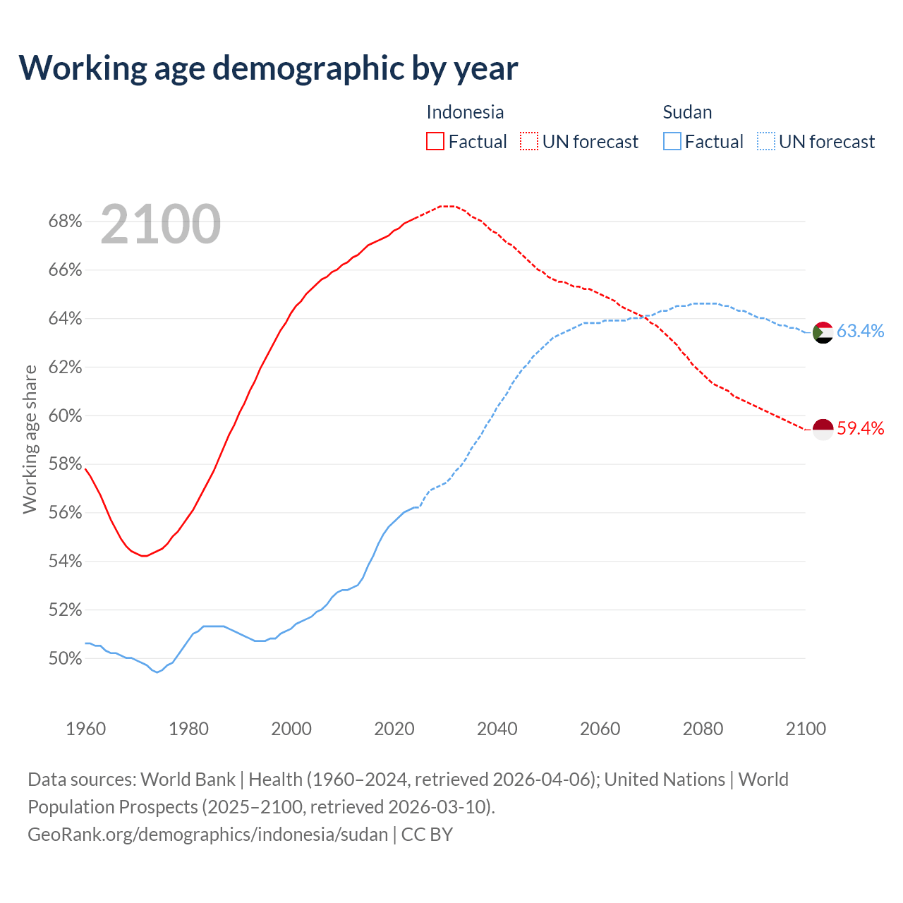 Median age Indonesia vs Sudan, 1960-2100