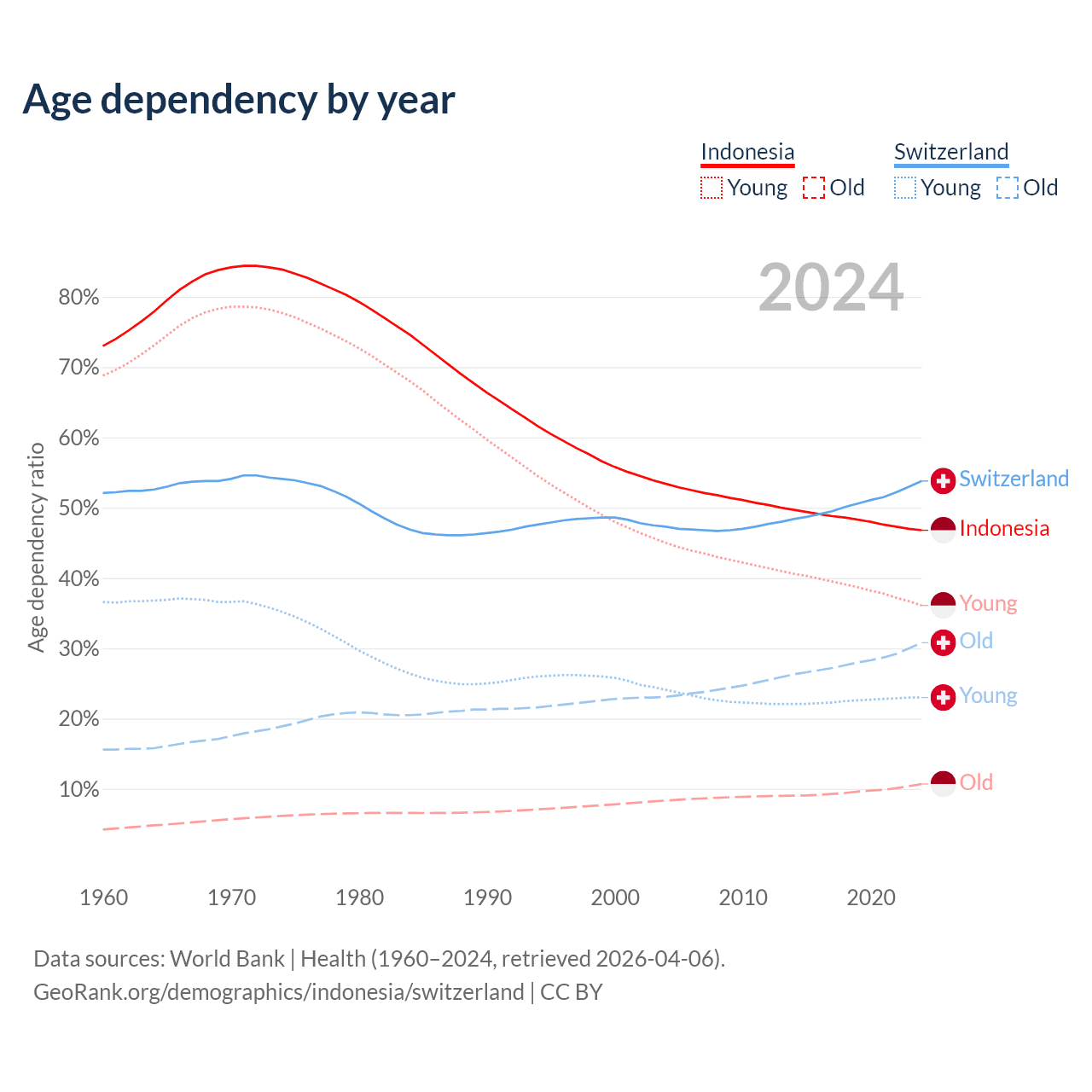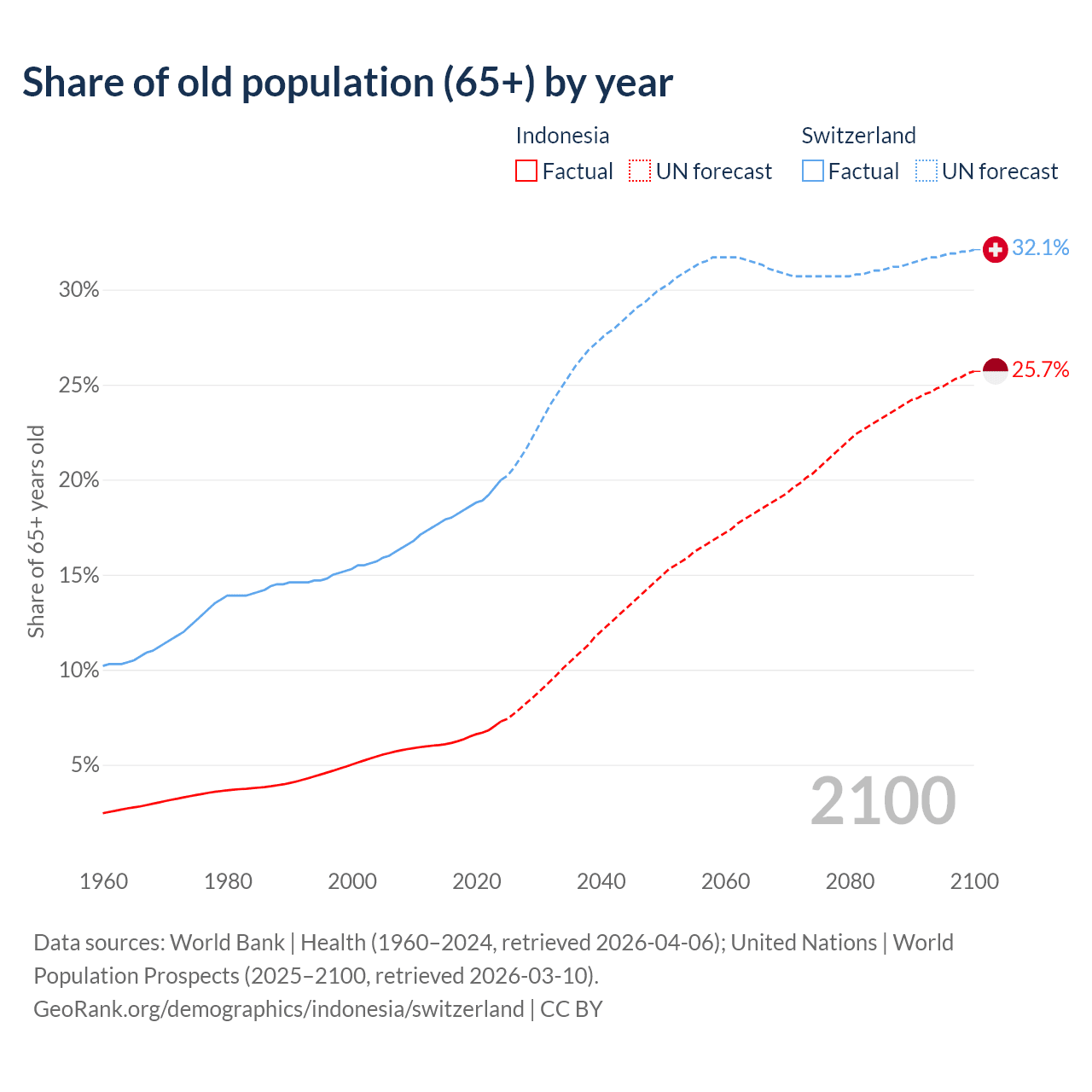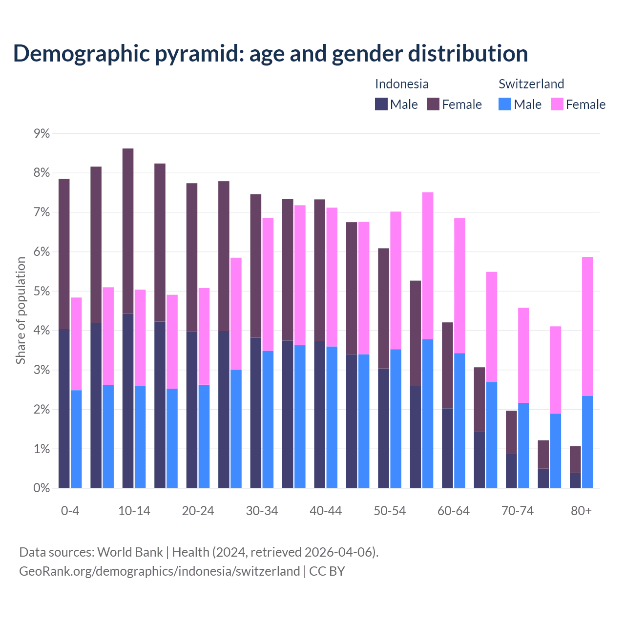 The share of older people aged 65 and over is 7.29% in Indonesia and 20% in Switzerland. Life expectancy in Indonesia compared to Switzerland .