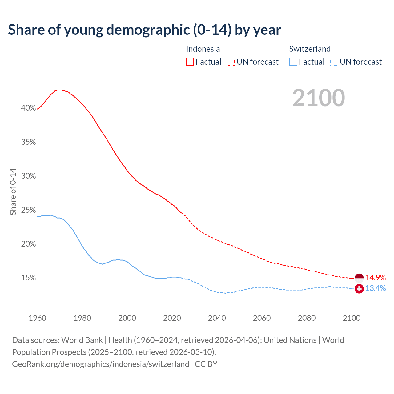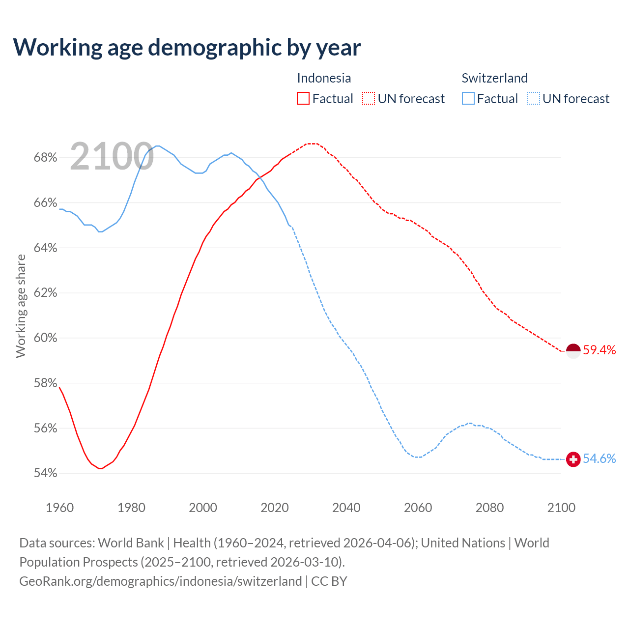 Median age Indonesia vs Switzerland, 1960-2100