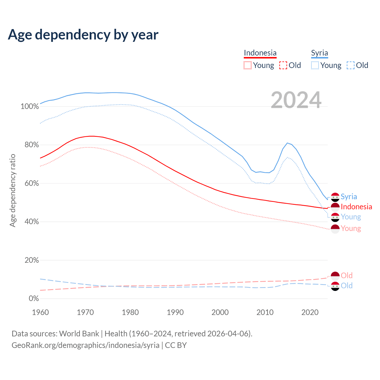 - Indonesia is ranked 93/196 by median age (oldest to youngest) vs 138/196 for Syria.