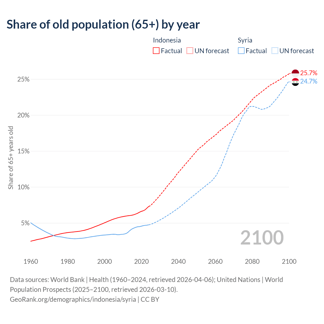 - The share of old-age demographic (65+) in Indonesia is 7.29% vs 4.74% in Syria.