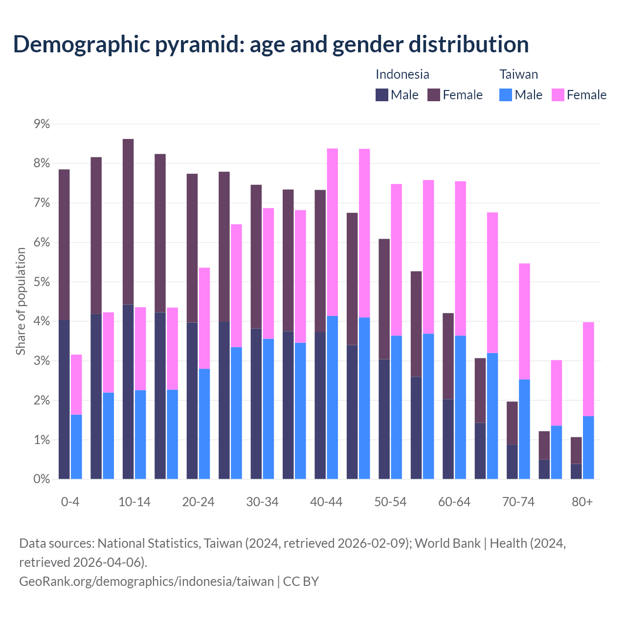 - Indonesia is ranked 93/196 by median age (oldest to youngest) vs 16/196 for Taiwan.