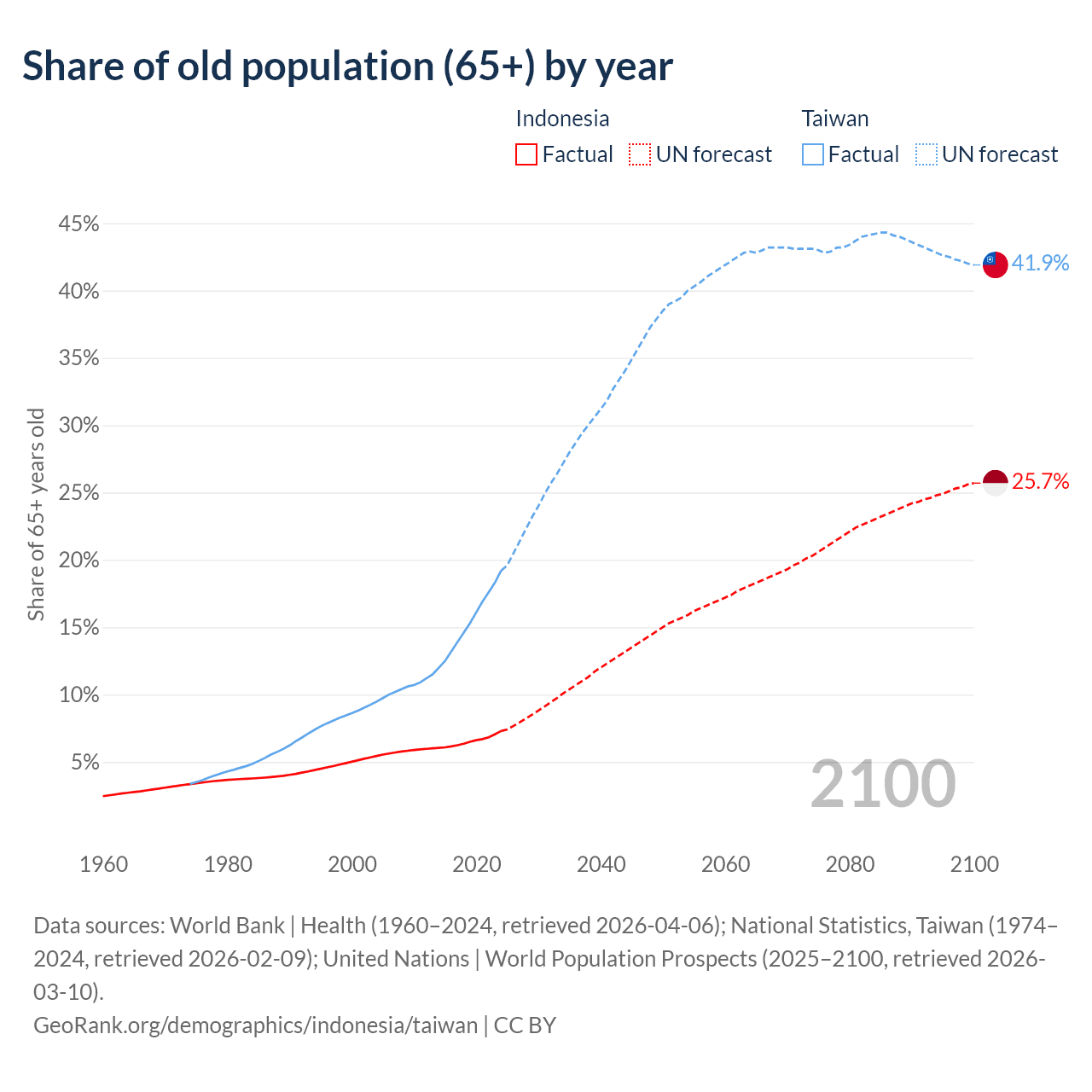 The share of older people aged 65 and over is 7.29% in Indonesia and 19.2% in Taiwan. Life expectancy in Indonesia compared to Taiwan .