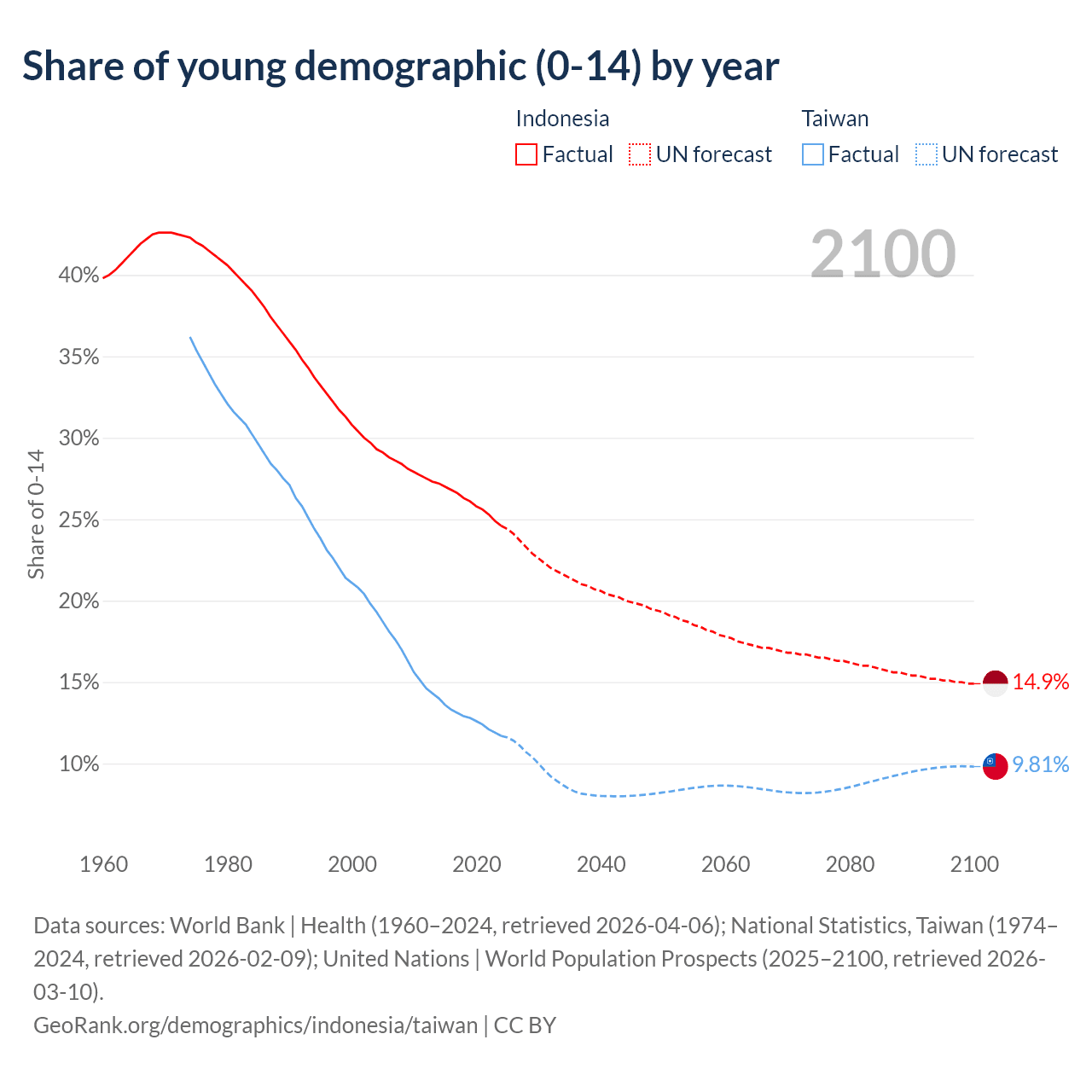 - As of 2026, the population of Indonesia is 289M vs 23.2M in Taiwan - 12.4 times difference.