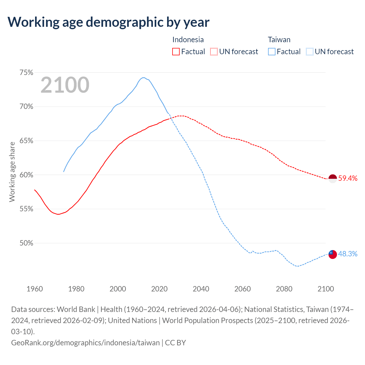 - Indonesia has 197M working age adults (aged 15-64) vs 16.1M in Taiwan.