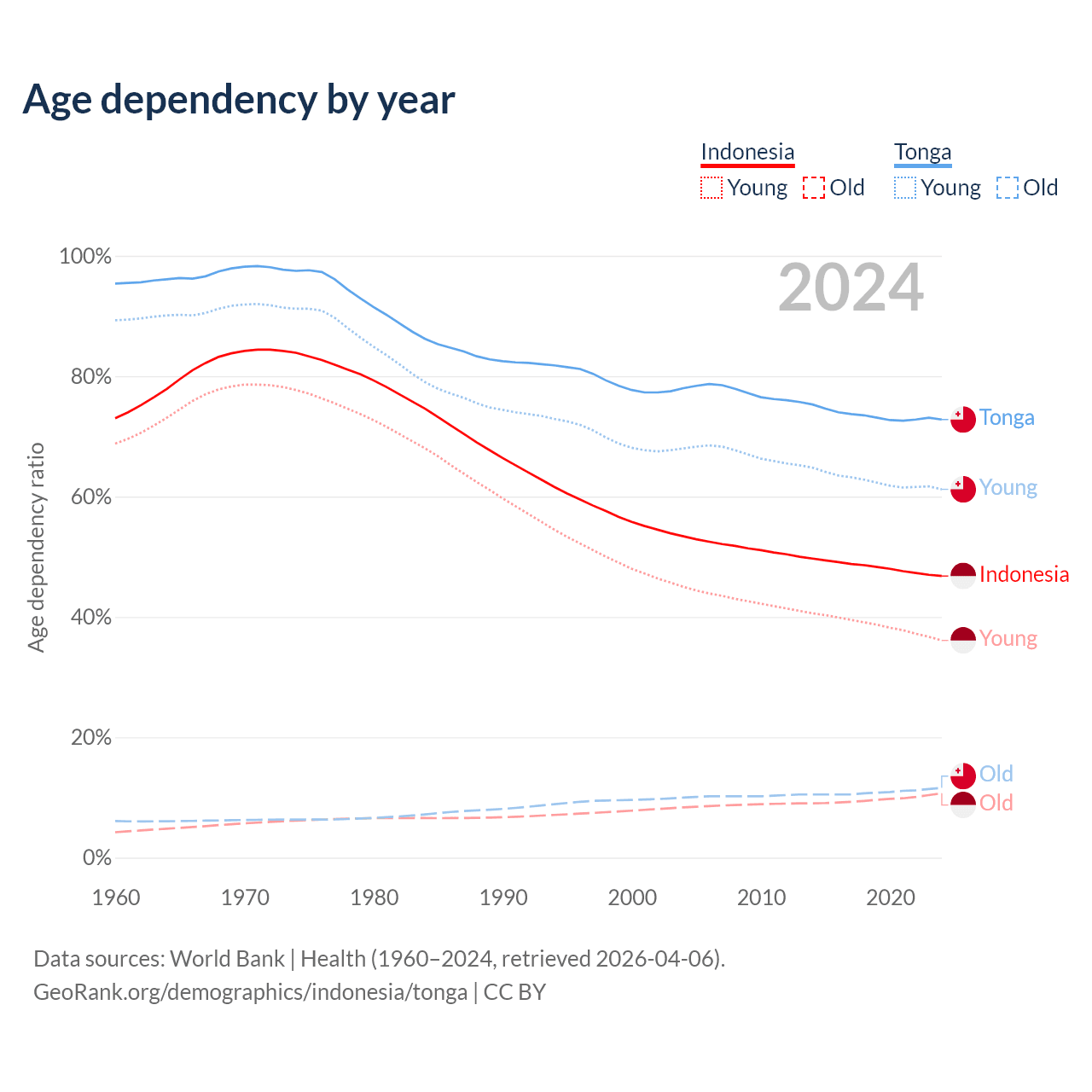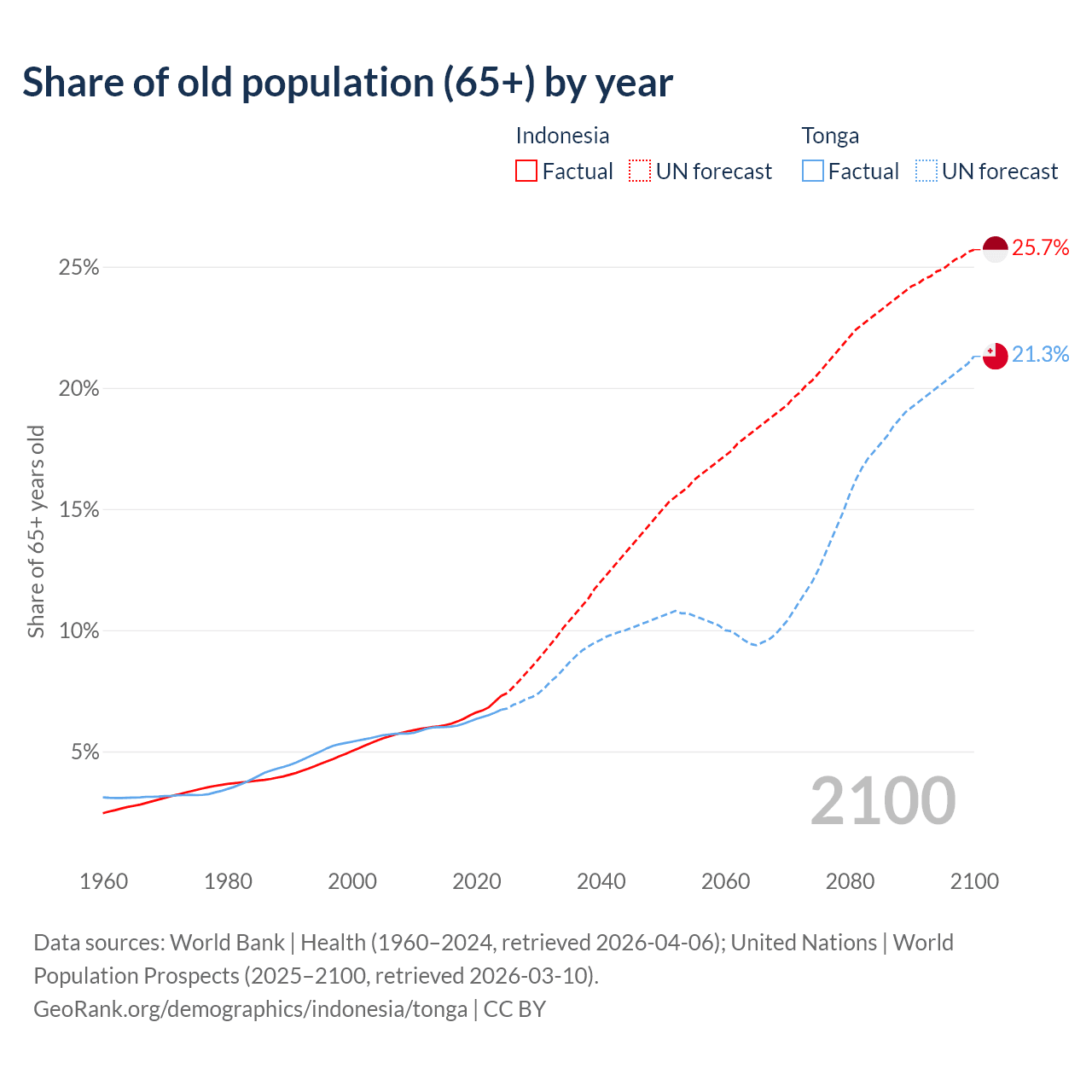 The share of older people aged 65 and over is 7.29% in Indonesia and 6.72% in Tonga. Life expectancy in Indonesia compared to Tonga .