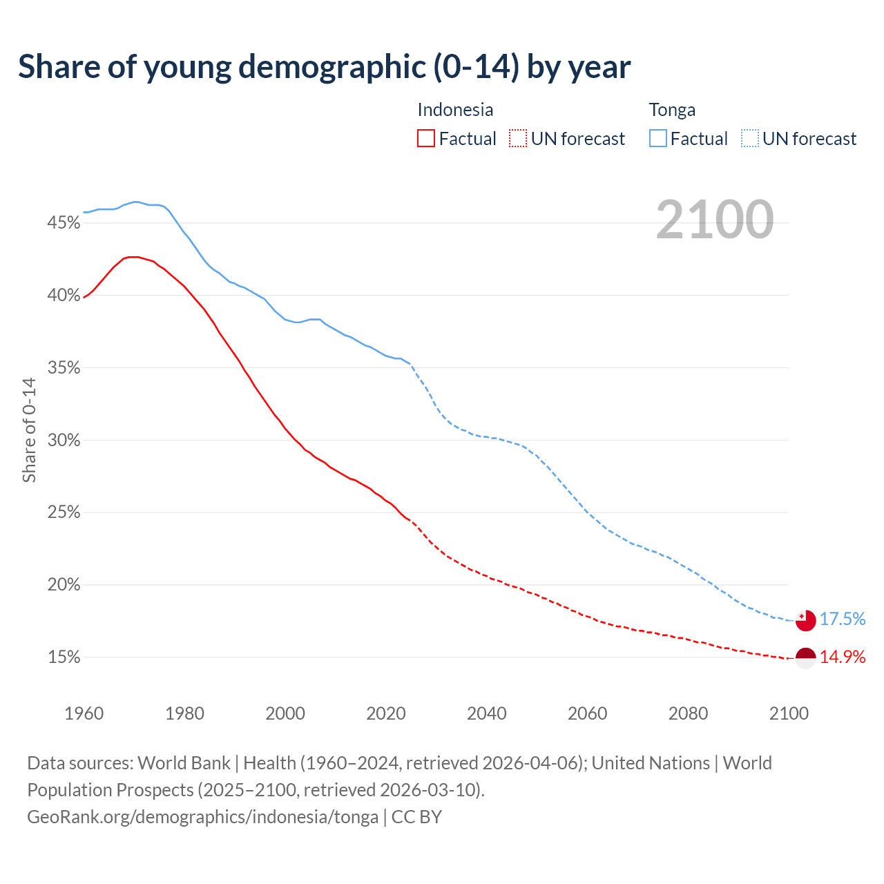 Median age Indonesia vs Tonga, 1960-2100
