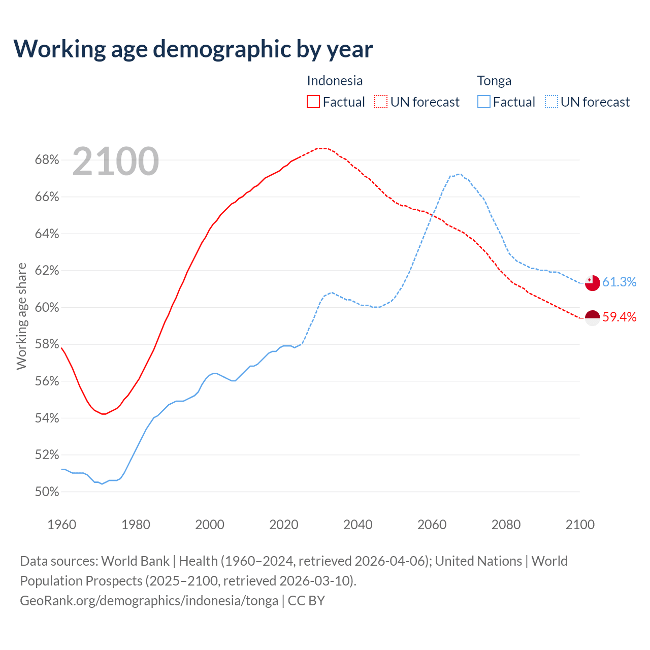 - Indonesia has 197M working age adults (aged 15-64) vs 59.8K in Tonga.