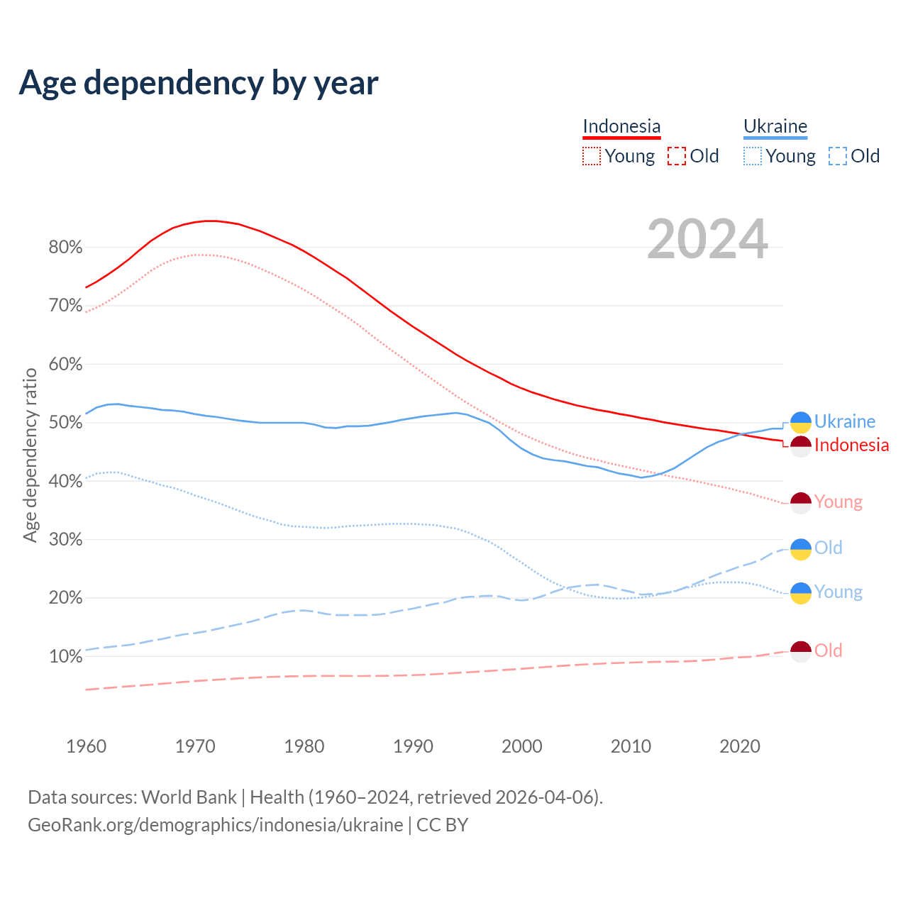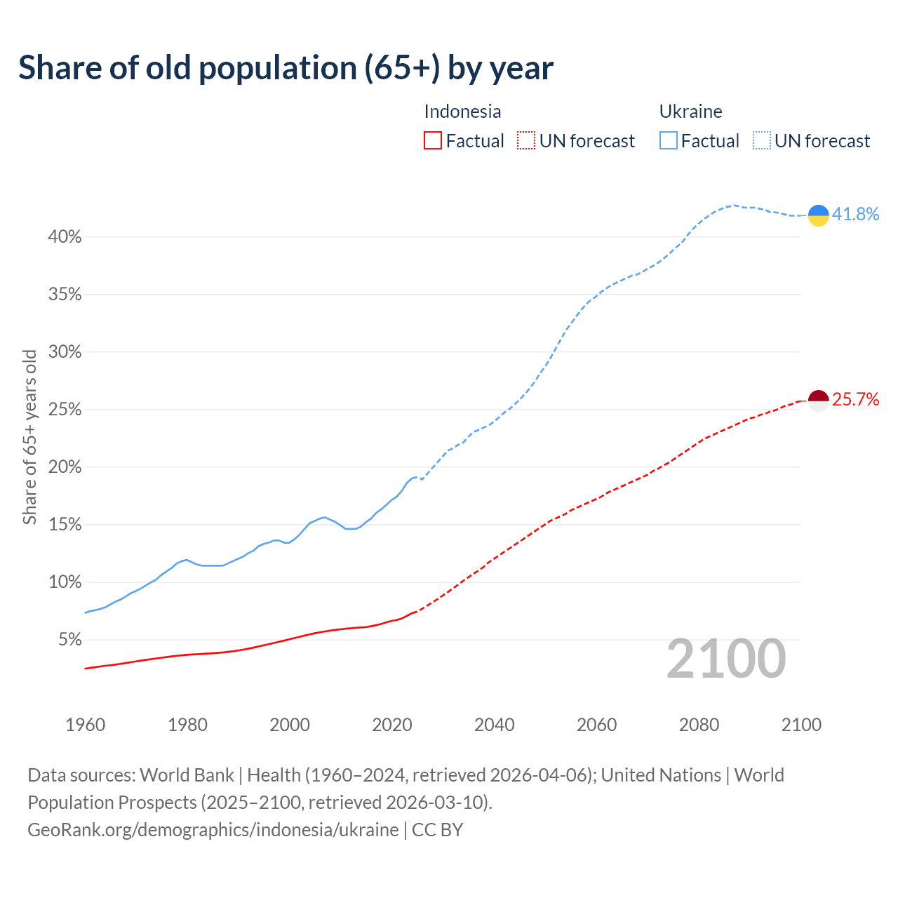 The share of older people aged 65 and over is 7.29% in Indonesia and 19% in Ukraine. Life expectancy in Indonesia compared to Ukraine .