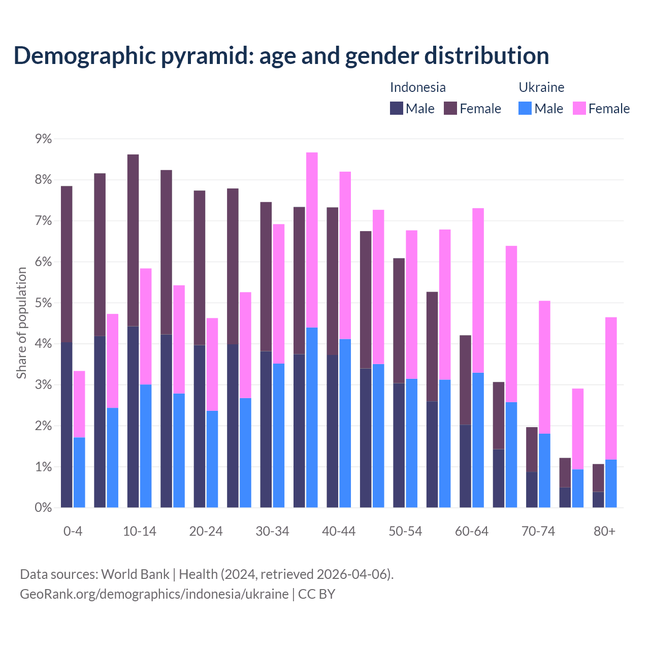 - Indonesia is ranked 93/196 by median age (oldest to youngest) vs 26/196 for Ukraine.