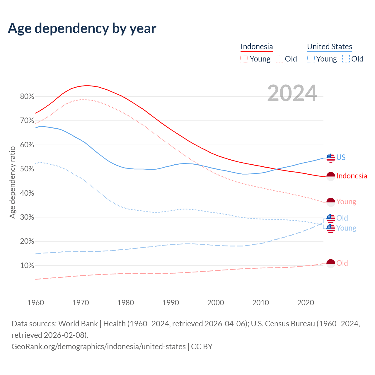 - Indonesia is ranked 93/196 by median age (oldest to youngest) vs 50/196 for the United States.