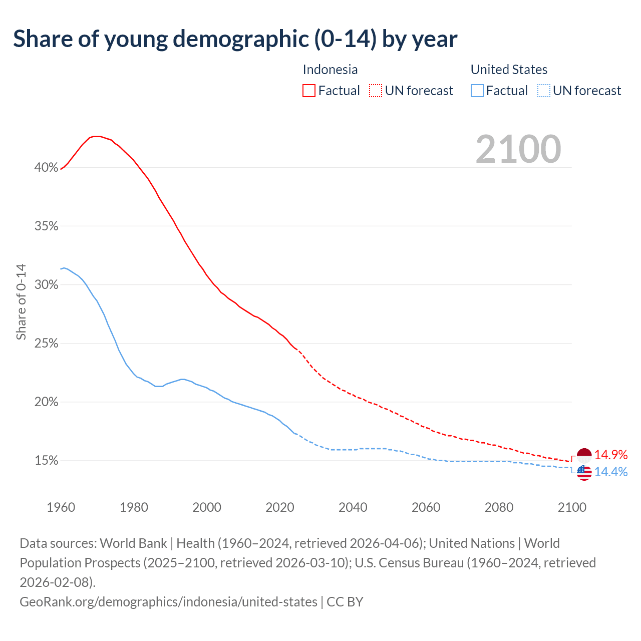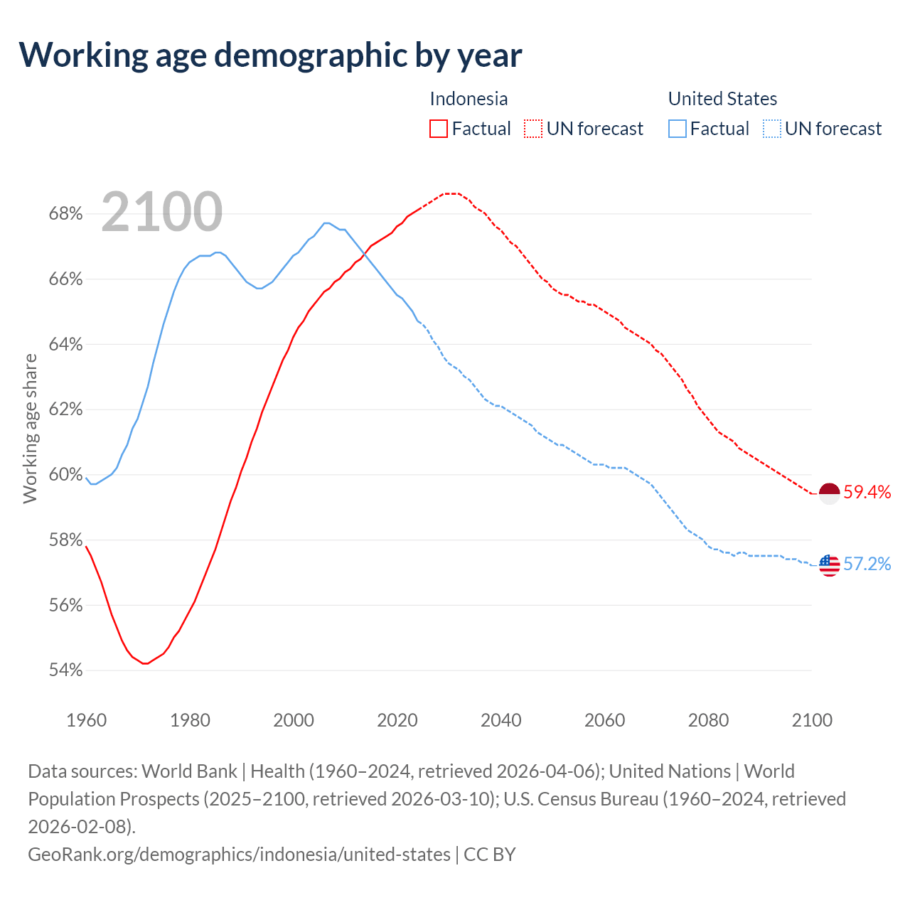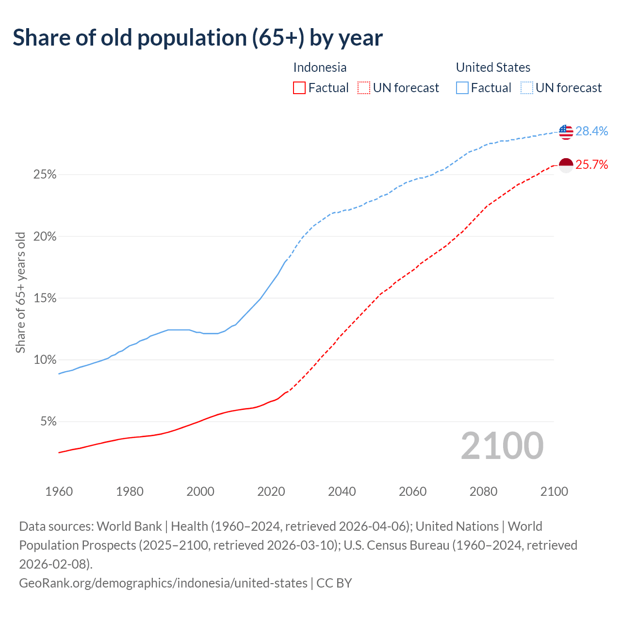 Median age Indonesia vs United States, 1960-2100