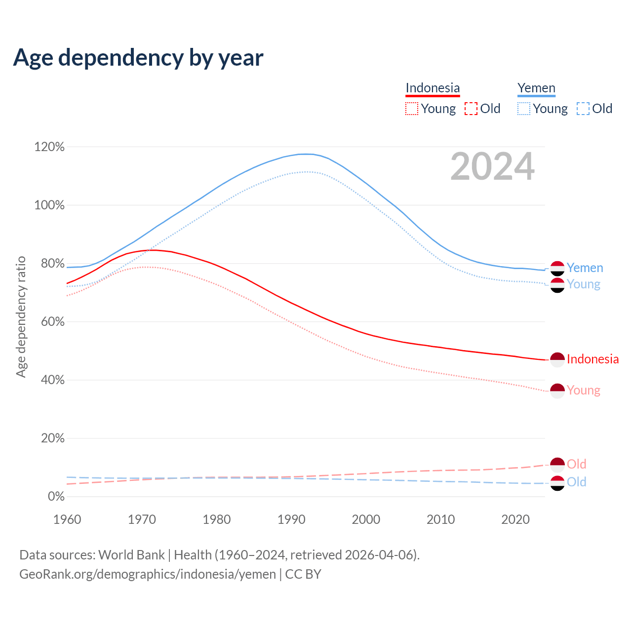 - The share of old-age demographic (65+) in Indonesia is 7.29% vs 2.52% in Yemen.