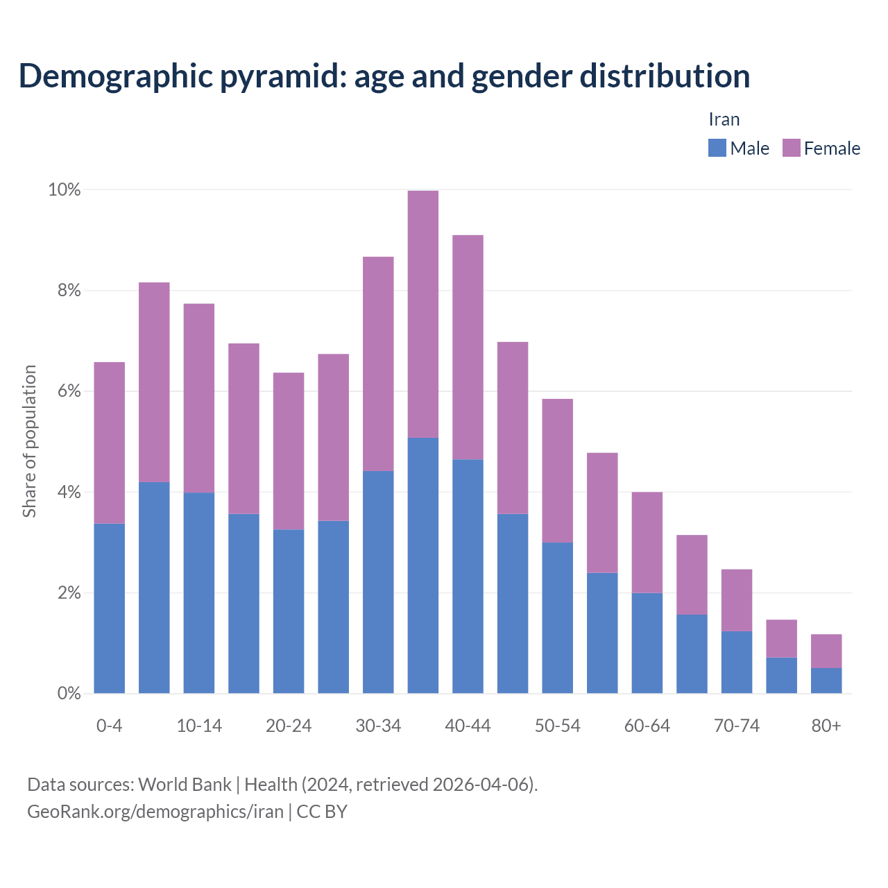 With a population of 91.6M people, Iran has a median age of 34.3 years which makes it the 79/196 oldest country. 22.4% of the demographic are children 0-14 years old, 69.3% are working-age people aged 15-64, and 8.24% are older population aged 65+ years.