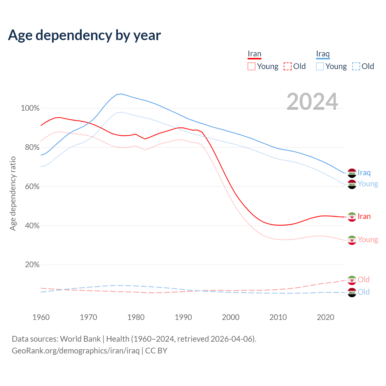 - Iran is ranked 79/196 by median age (oldest to youngest) vs 151/196 for Iraq.