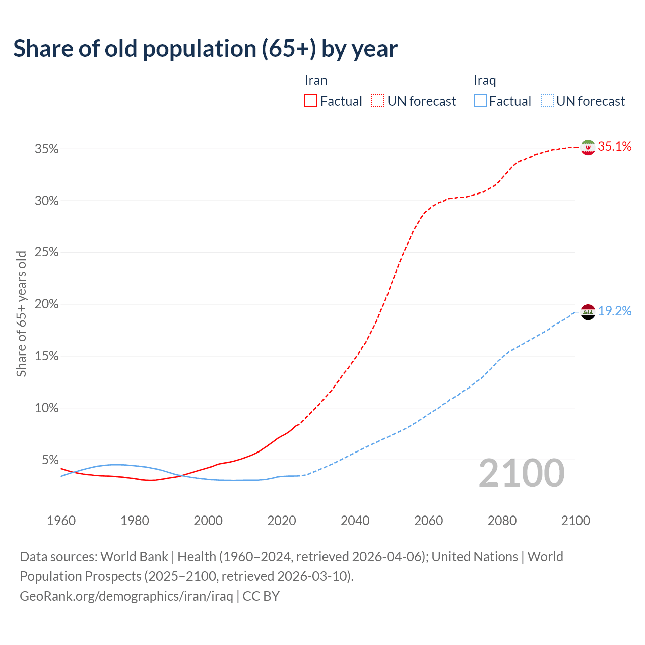 The share of older people aged 65 and over is 8.24% in Iran and 3.41% in Iraq. Life expectancy in Iran compared to Iraq .