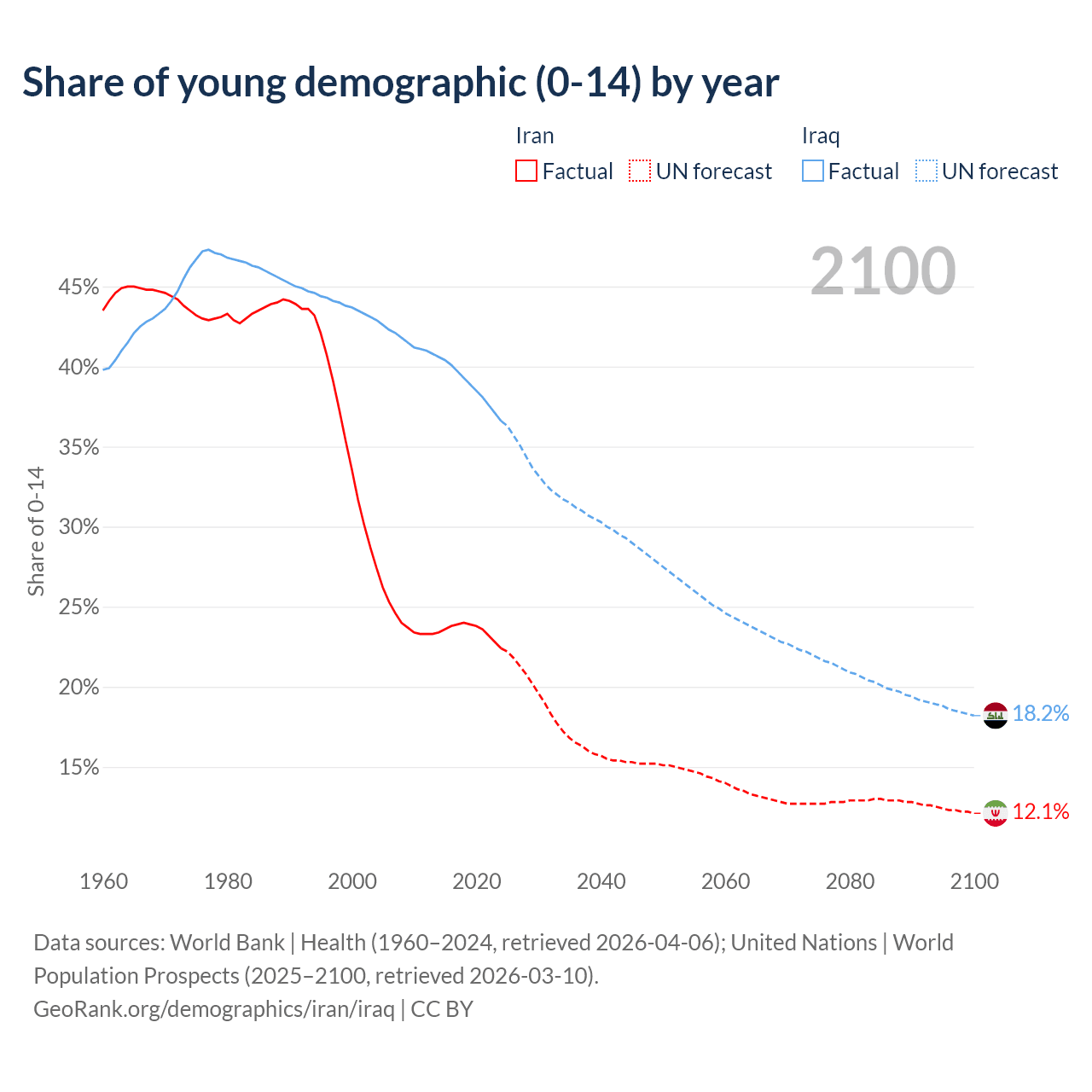 - The share of young demographic (0-15 years old) in Iran is 22.4% vs 36.6% in Iraq.
