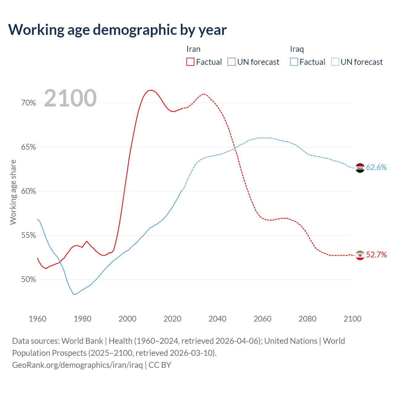 - Iran has 64.8M working age adults (aged 15-64) vs 29M in Iraq.