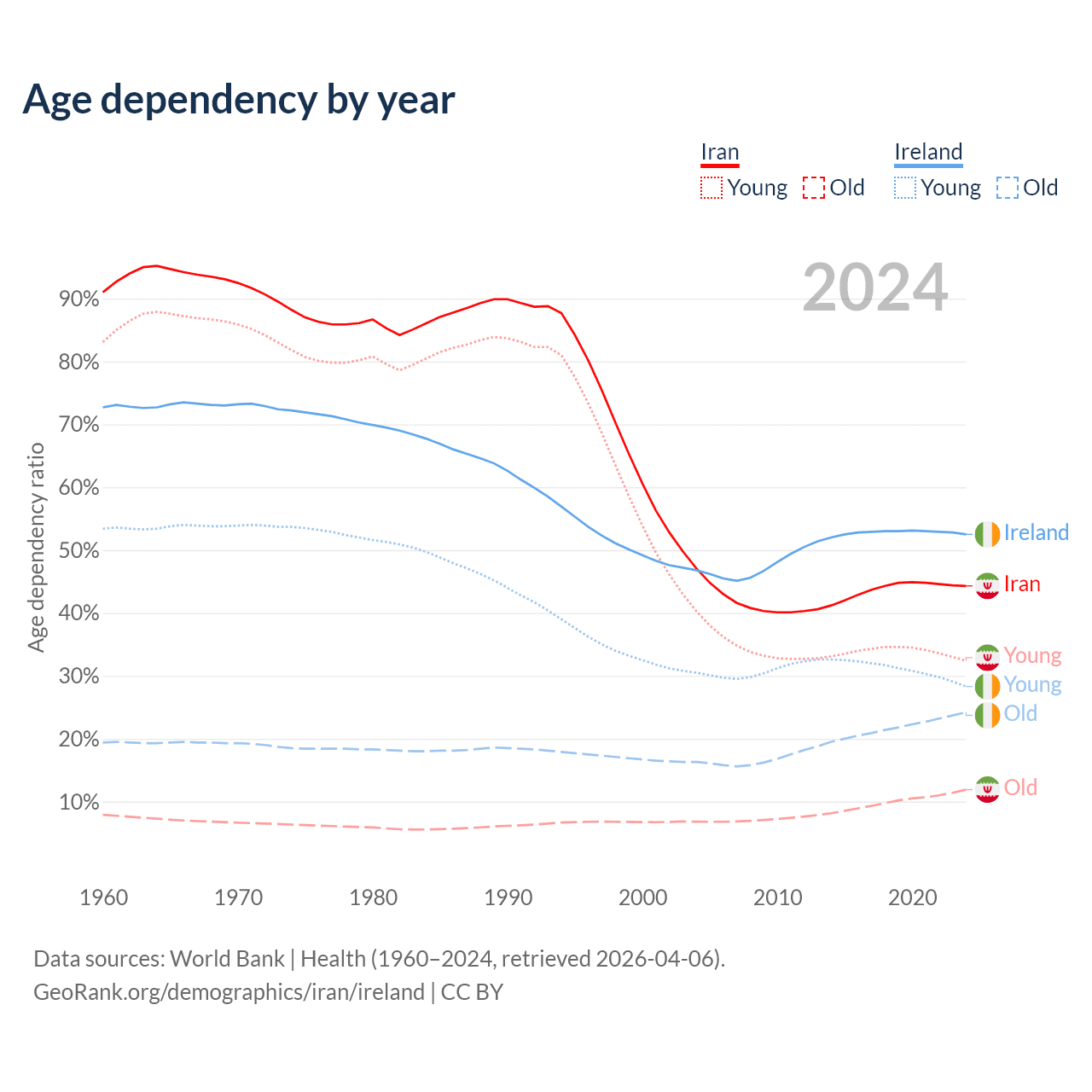 - Iran is ranked 79/196 by median age (oldest to youngest) vs 48/196 for Ireland.