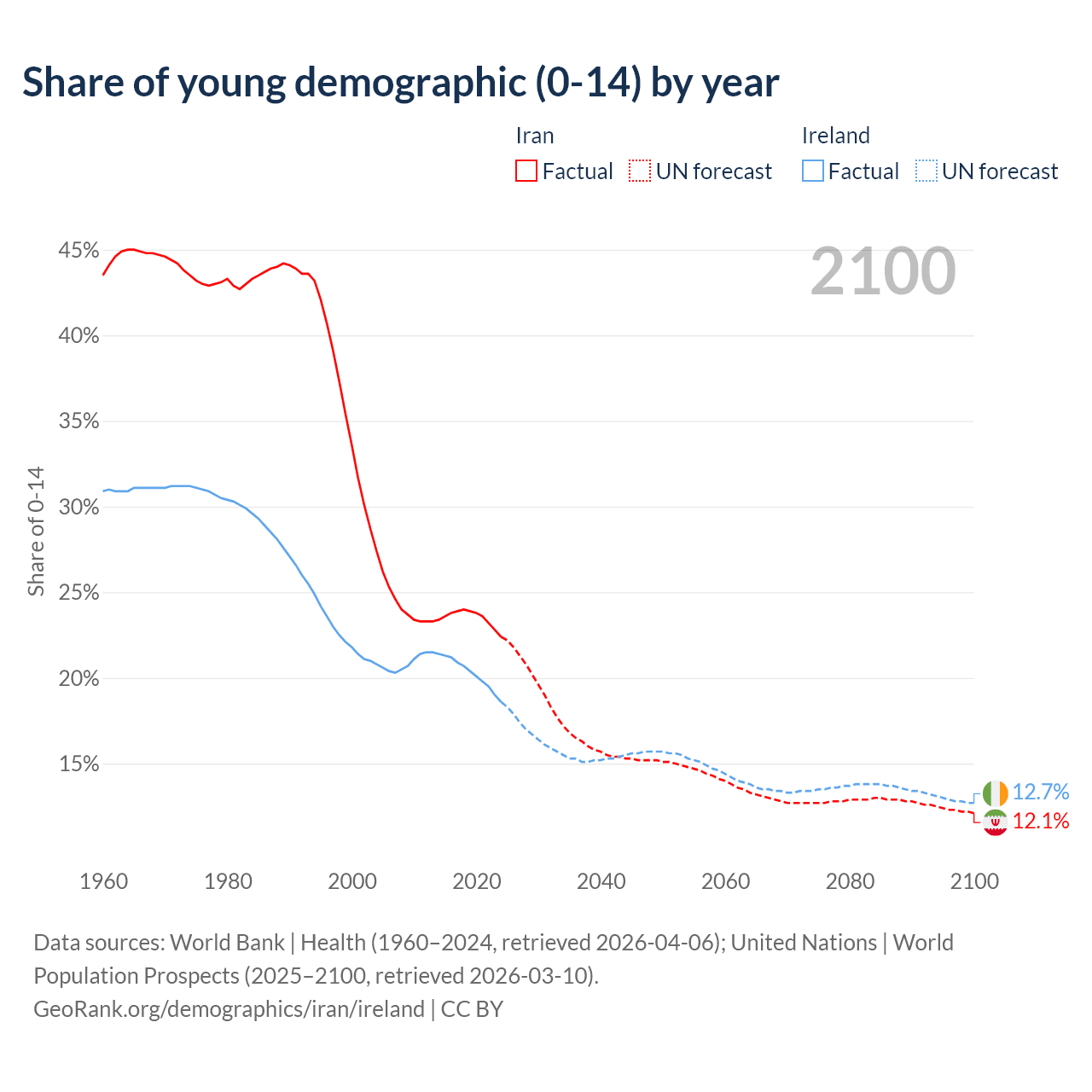 - The share of young demographic (0-15 years old) in Iran is 22.4% vs 18.6% in Ireland.