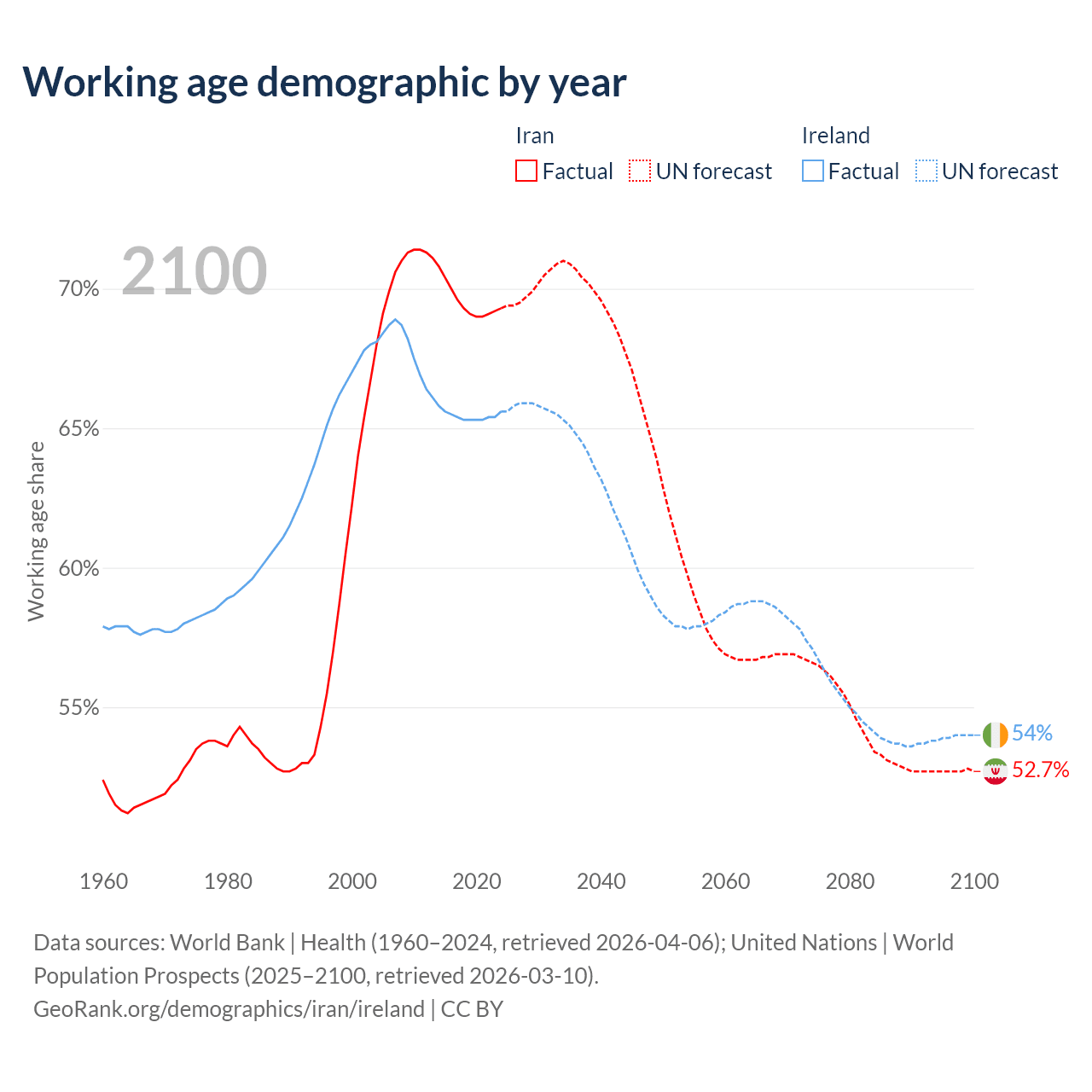 Median age Iran vs Ireland, 1960-2100