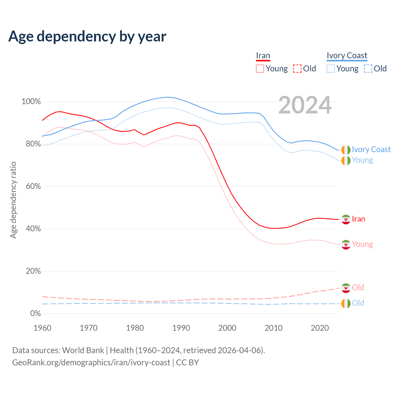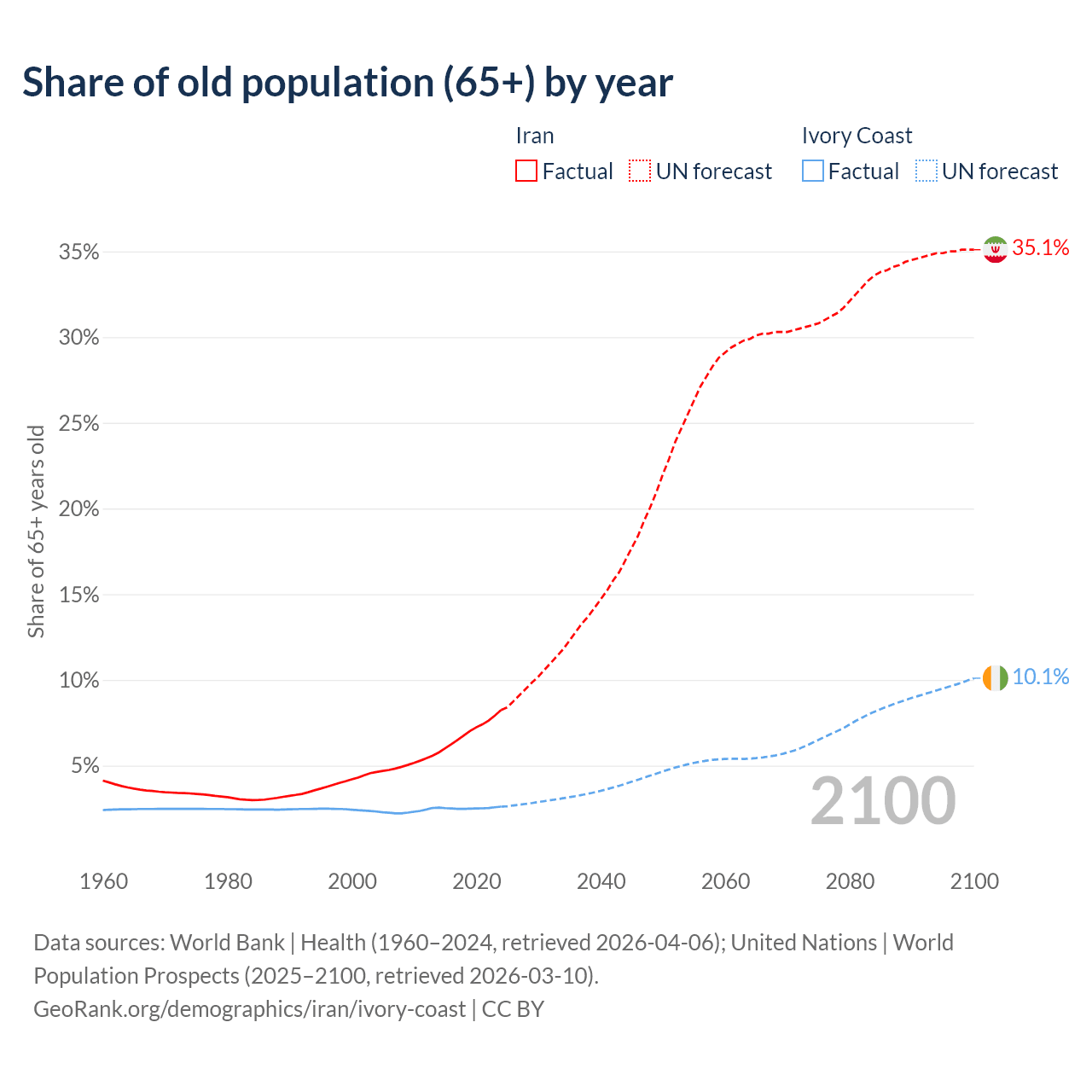 - The share of old-age demographic (65+) in Iran is 8.24% vs 2.61% in Ivory Coast.