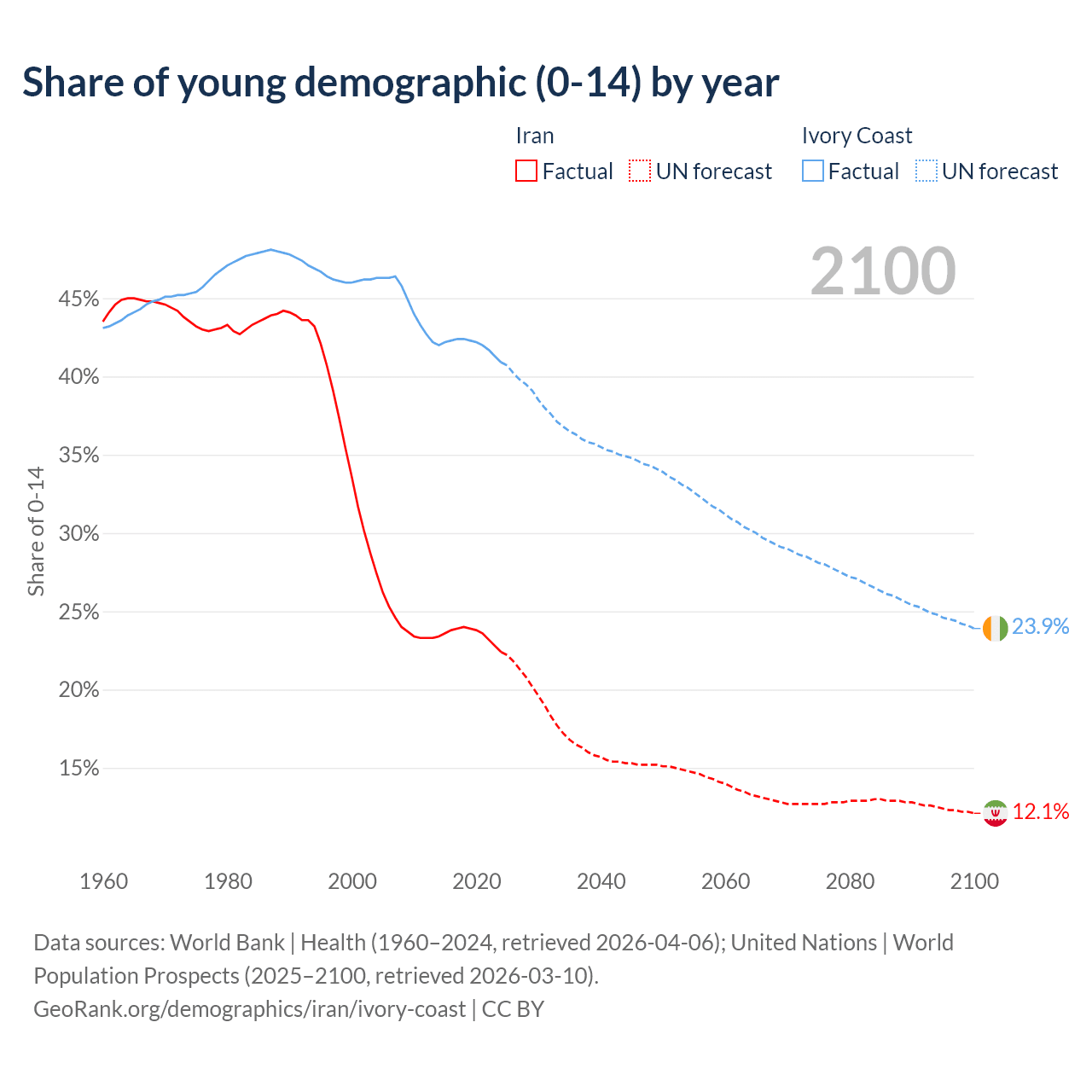 - The share of young demographic (0-15 years old) in Iran is 22.4% vs 40.9% in Ivory Coast.