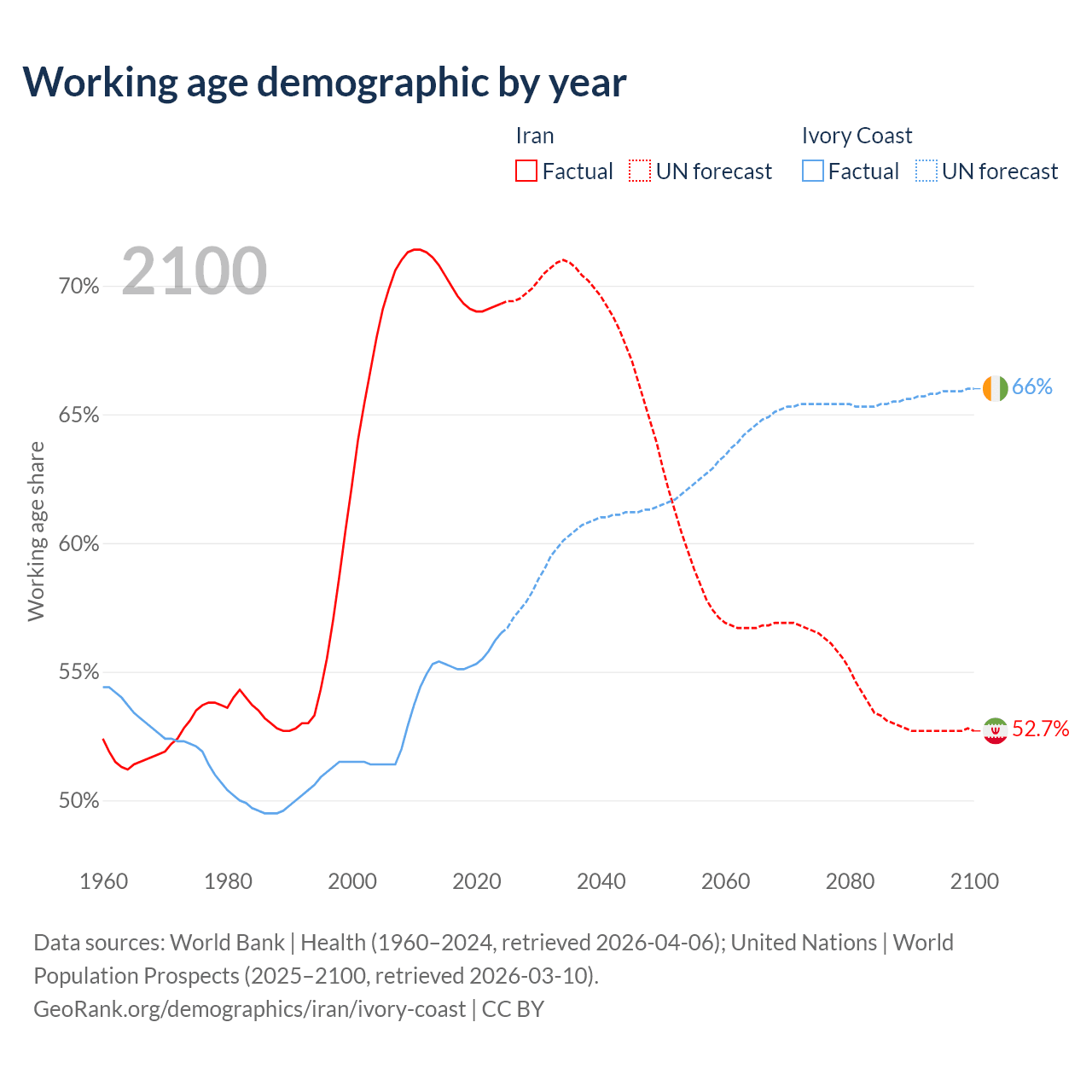Median age Iran vs Ivory Coast, 1960-2100