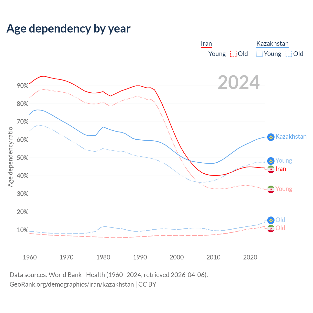 Data sources: World Bank | Health (1960–2024, retrieved 2026-04-06); U.S. Census Bureau (1960–2024, retrieved 2026-02-08).