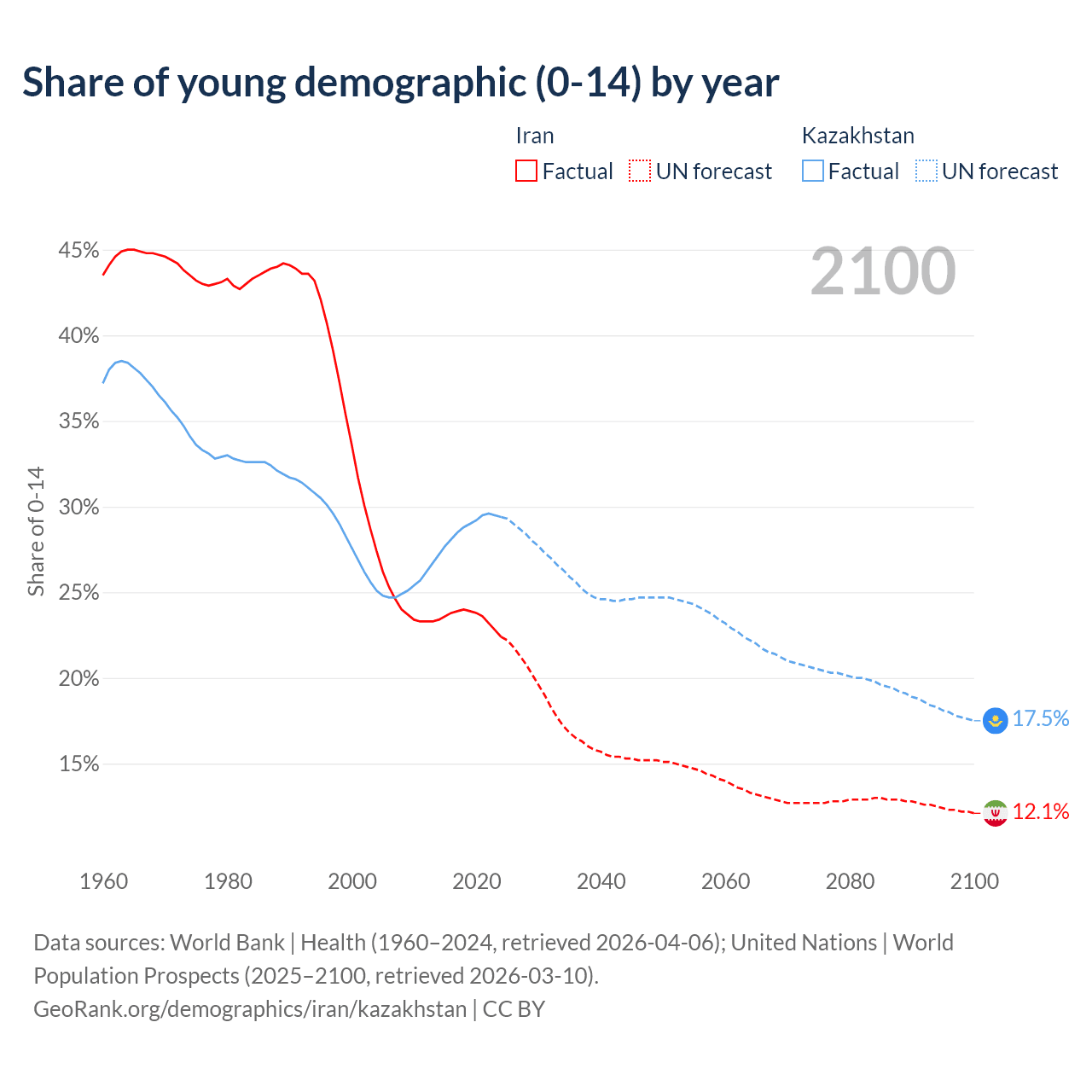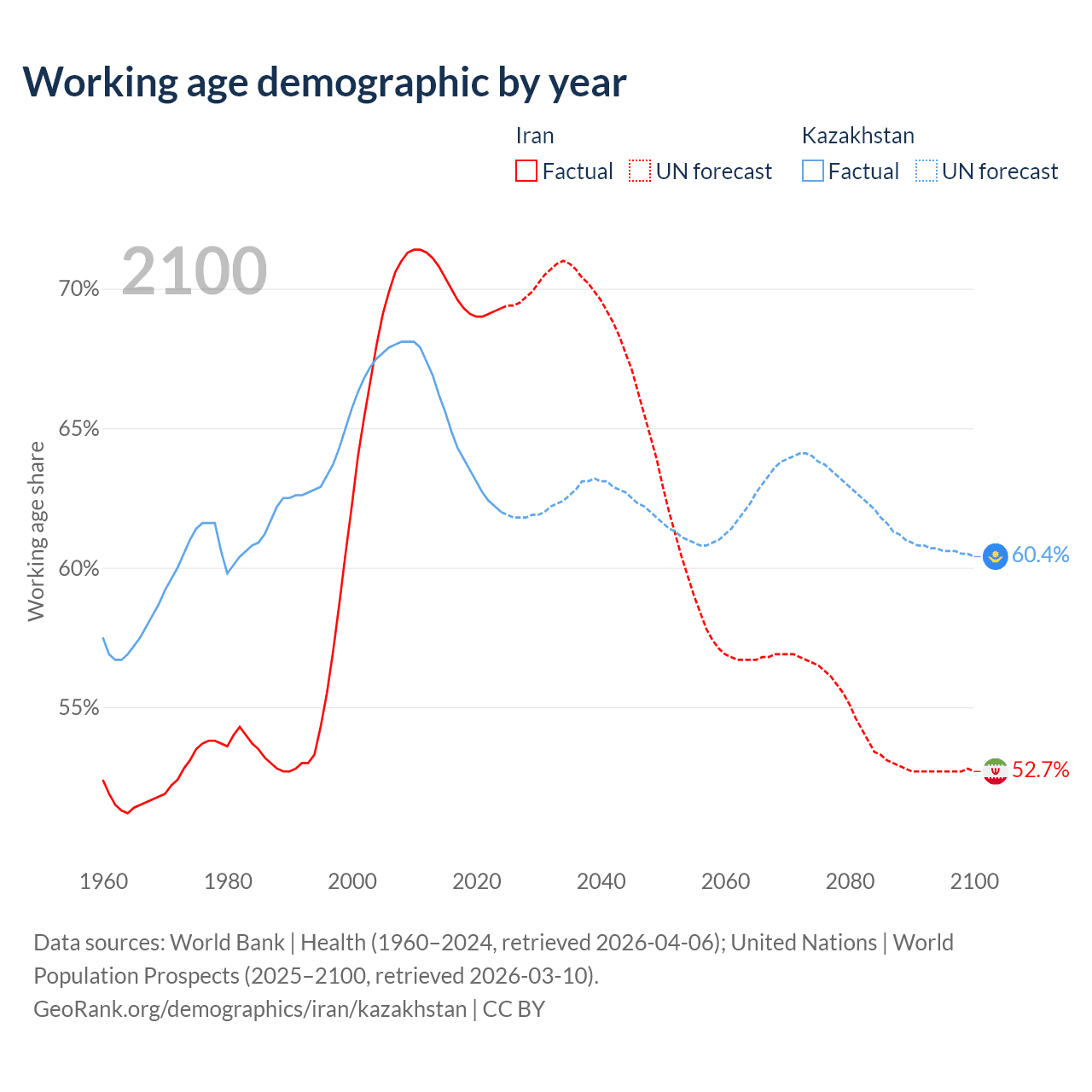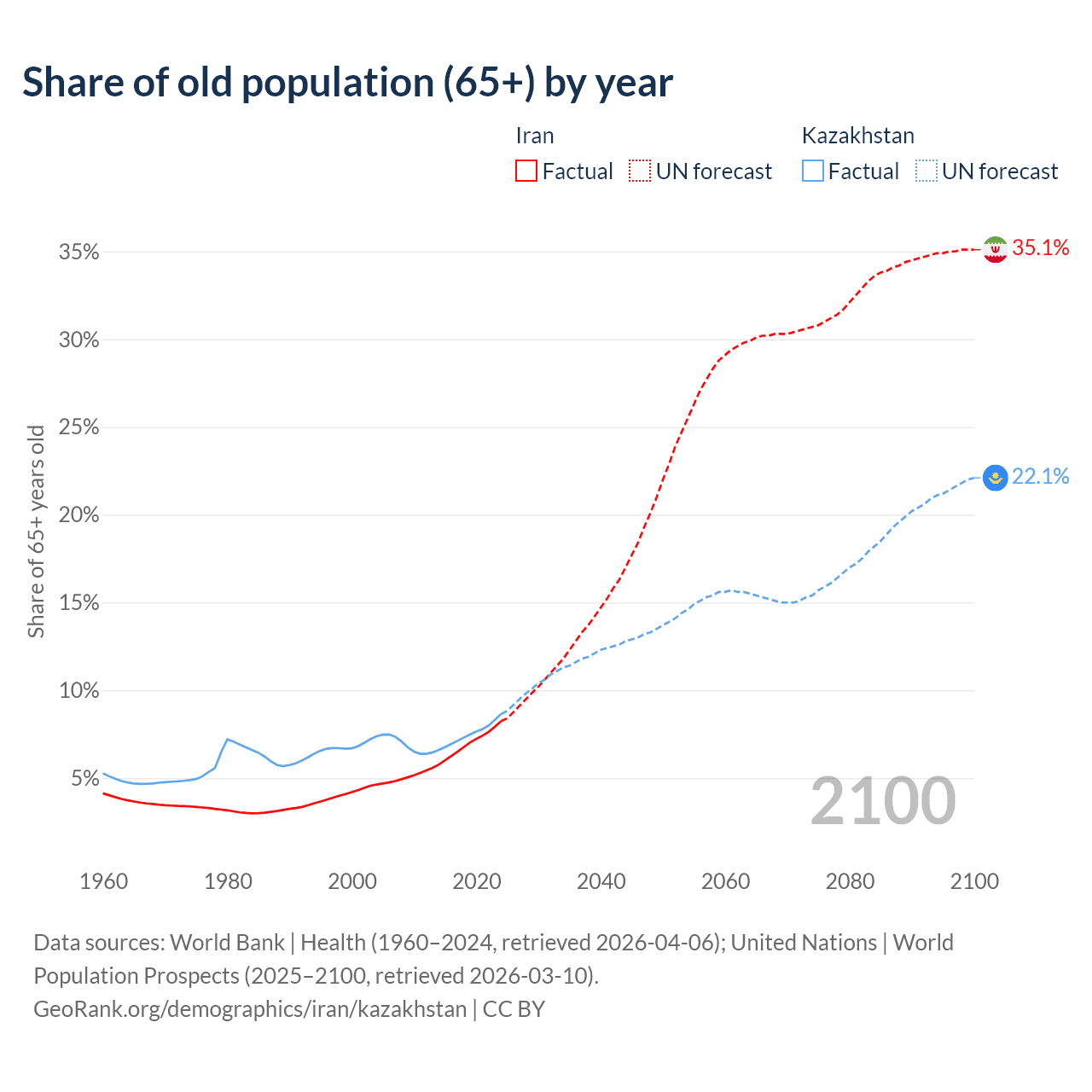 Median age Iran vs Kazakhstan, 1960-2100