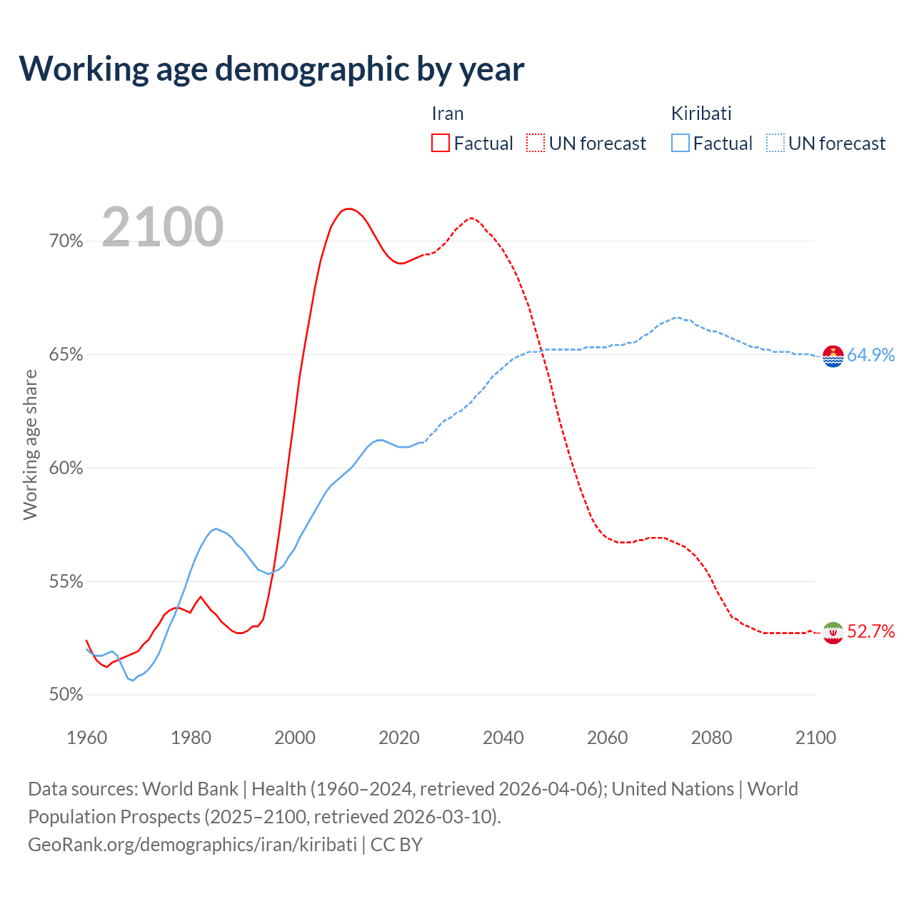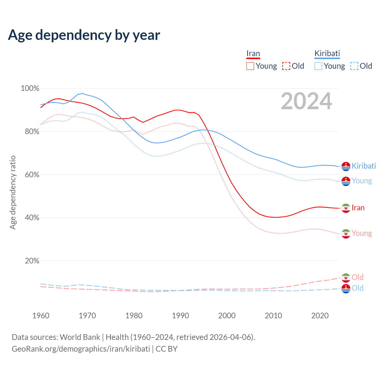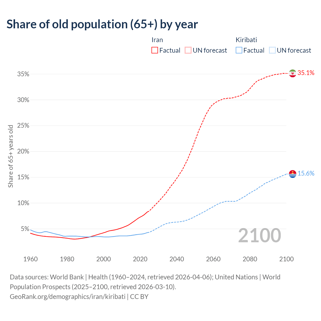 - The share of old-age demographic (65+) in Iran is 8.24% vs 4.24% in Kiribati.